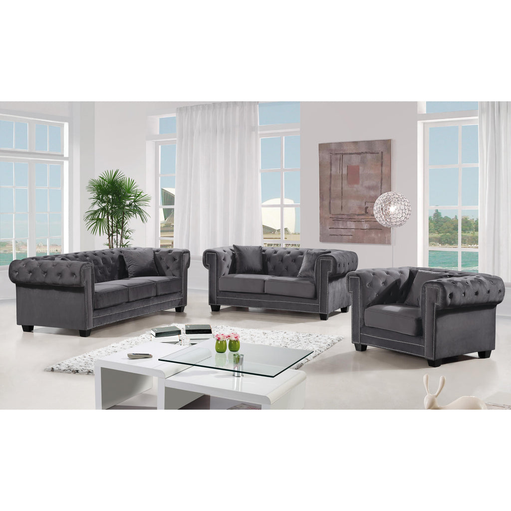 The Bowery Collection by Meridian Furniture. Features beautifully designed tufted velvet upholstery with custom wood legs and a nail head trim. This collection is guaranteed to be the highlight of any home. Throw pillows included.