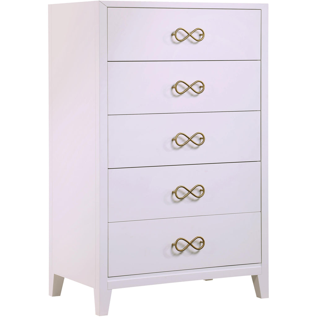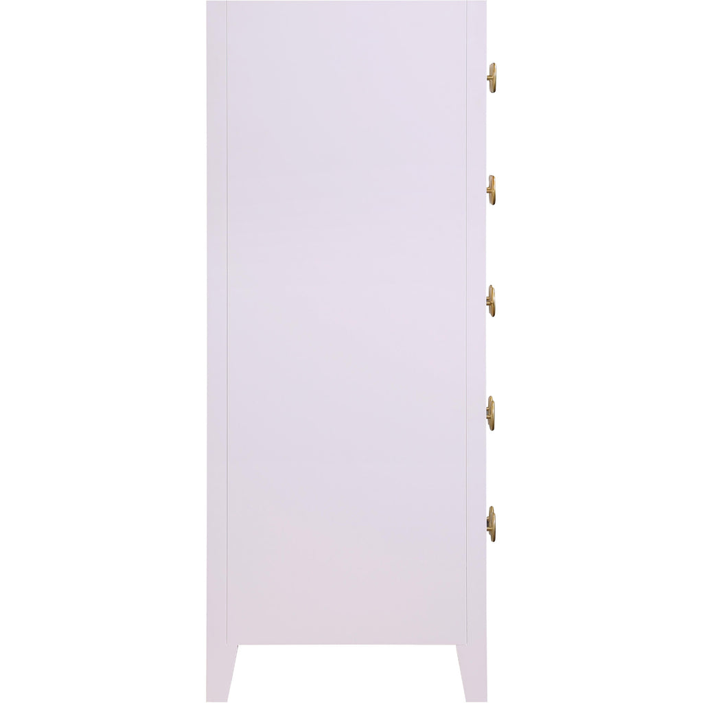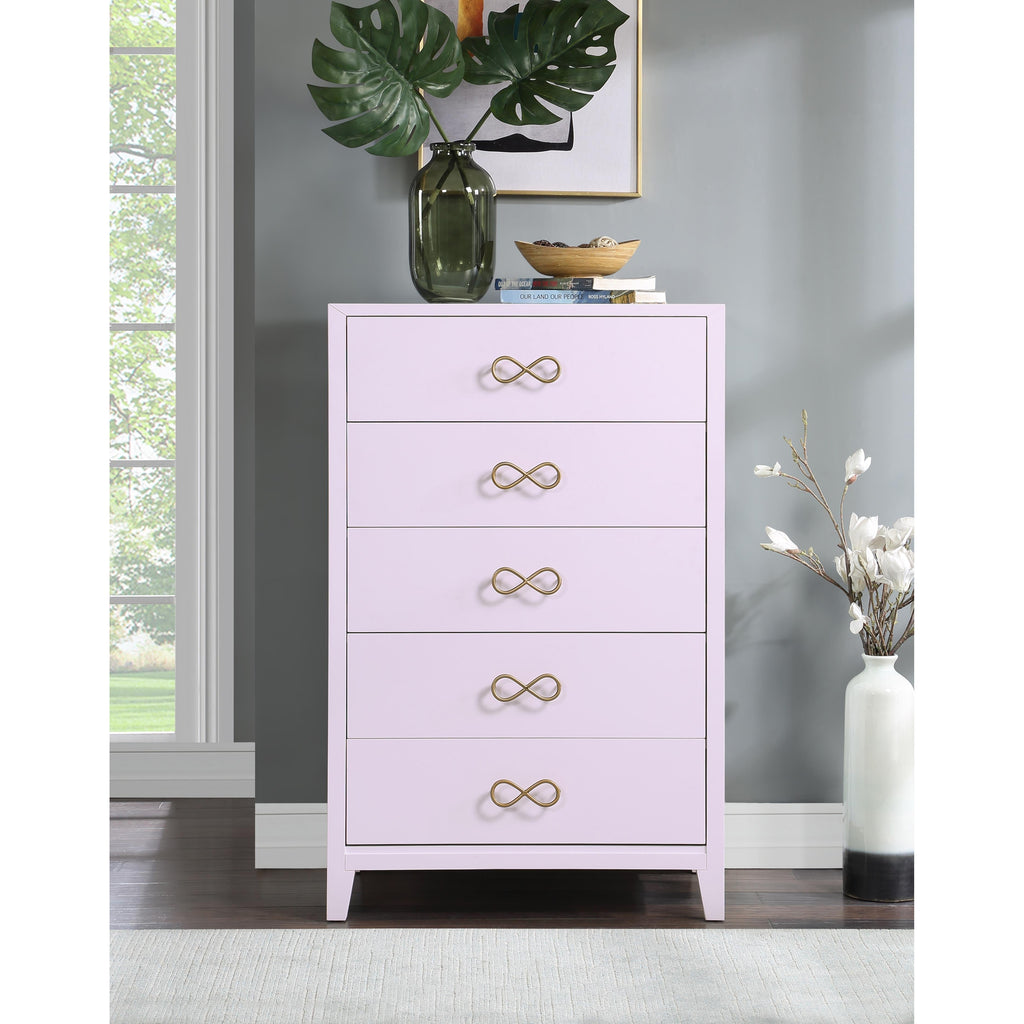 Bring unique elegance to your bedroom with this Bowtie pink/gold chest from Meridian Furniture. This chest features five drawers, providing you with plenty of storage space for clothes, linens, or miscellaneous objects. Its light pink color adds a touch of femininity to your living space, and its brushed gold bow tie handles complement your existing decor. Its flat top is perfect for placing a lamp, framed picture, books, bric-a-brac, and more.