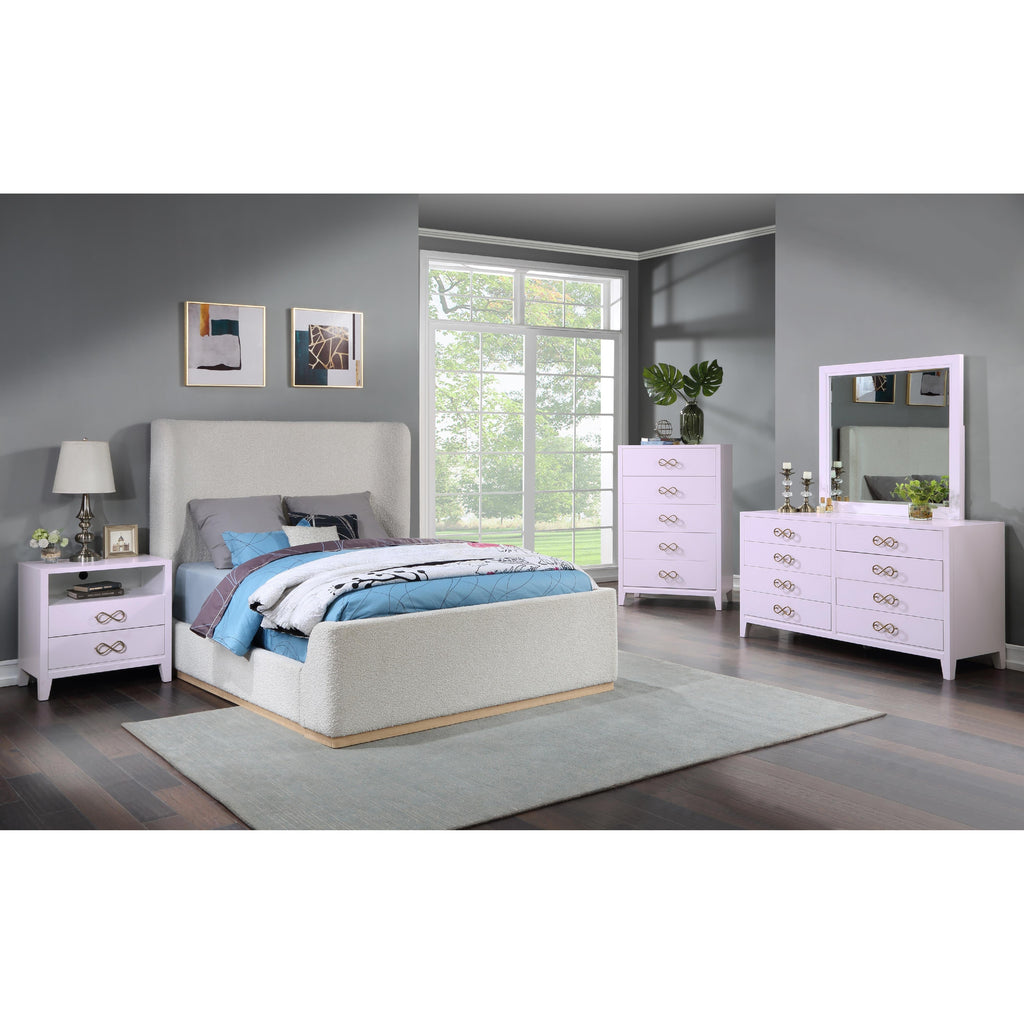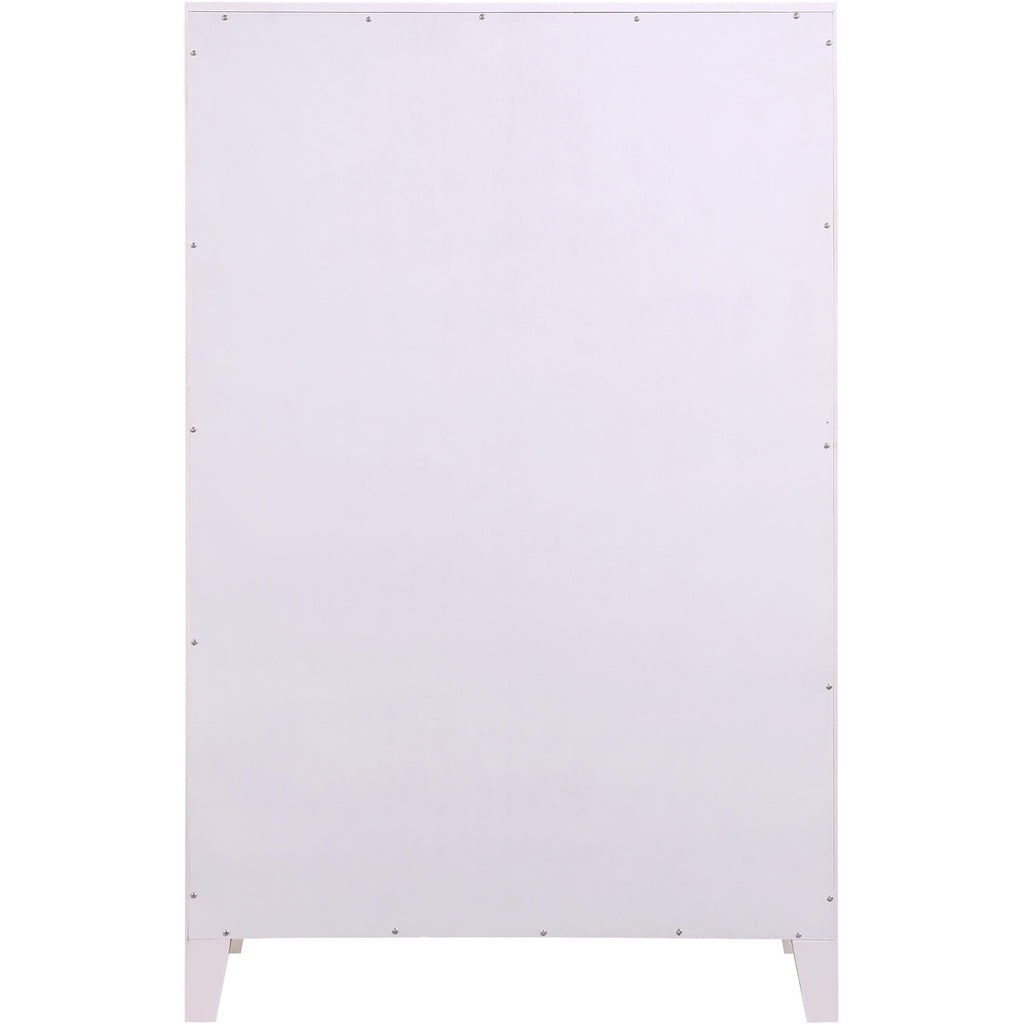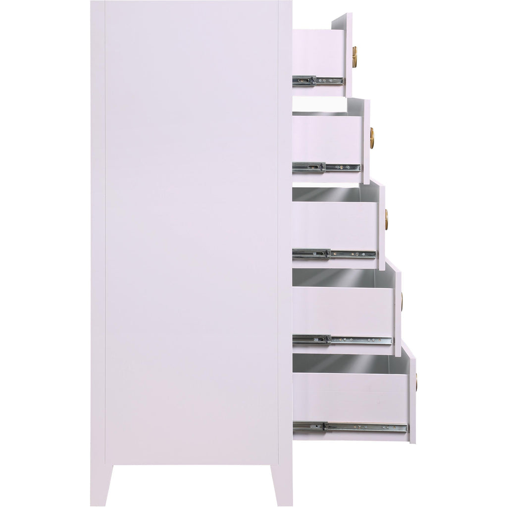 Bring unique elegance to your bedroom with this Bowtie pink/gold chest from Meridian Furniture. This chest features five drawers, providing you with plenty of storage space for clothes, linens, or miscellaneous objects. Its light pink color adds a touch of femininity to your living space, and its brushed gold bow tie handles complement your existing decor. Its flat top is perfect for placing a lamp, framed picture, books, bric-a-brac, and more.