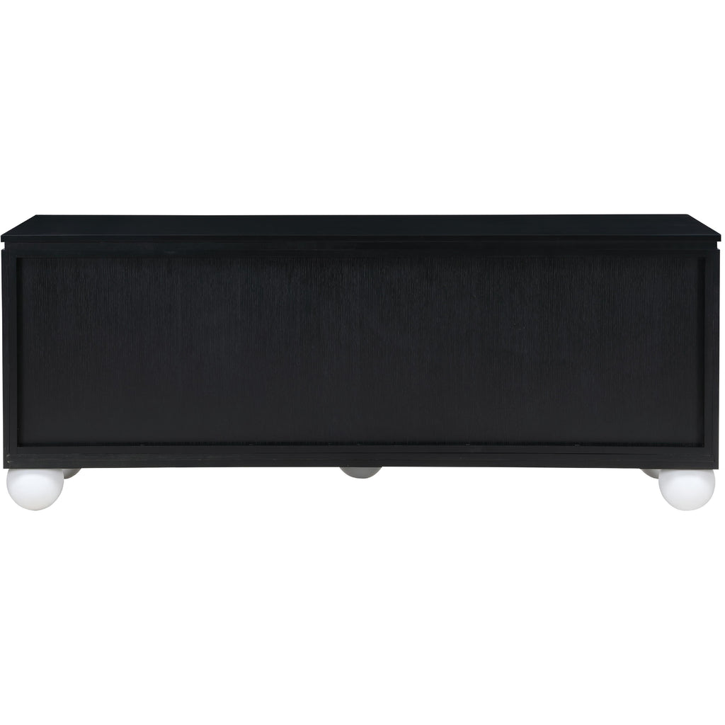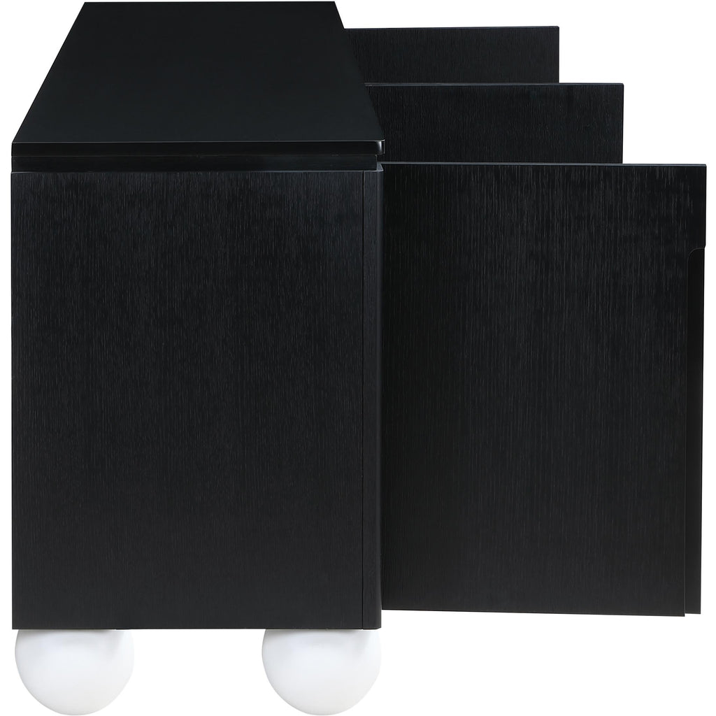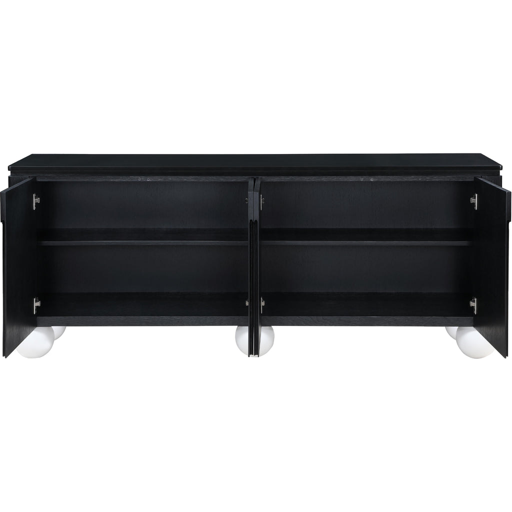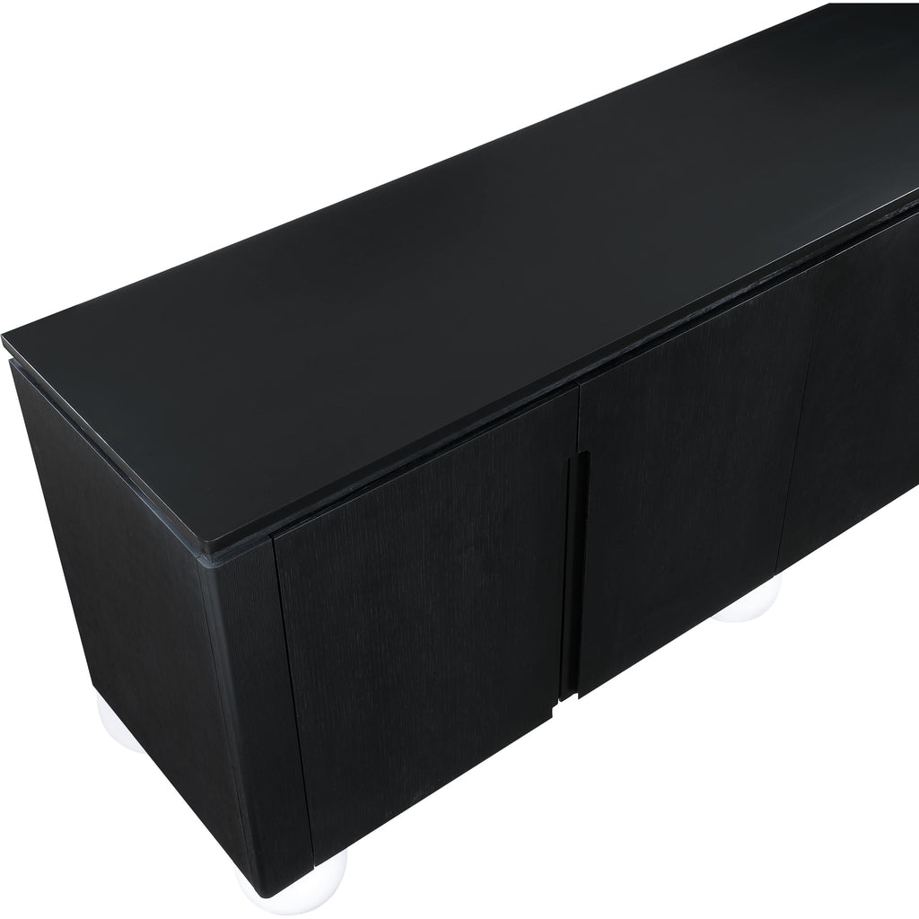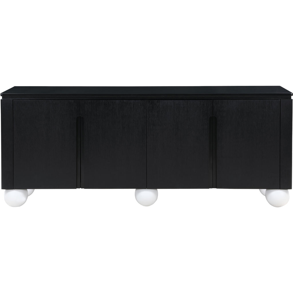 Transform your dining space into a haven of modern elegance with the Cardiff Black Sideboard Buffet. Featuring a rich black oak finish contrasted with white lacquer legs and a black lacquer top, it creates a sleek and modern aesthetic. Crafted mostly from solid wood with oak veneer made from rubberwood, as well as some parts made from MDF plywood, it boasts natural wood grain variation for added charm. This versatile piece serves as an elegant storage solution and a stylish platform for decorations. With doors designed to conceal cutlery, dishes, napkins, and dining supplies, it ensures your dining area stays organized and clutter-free. Elevate your dining experience with this handsome sideboard buffet that meshes practicality and sophistication effortlessly.