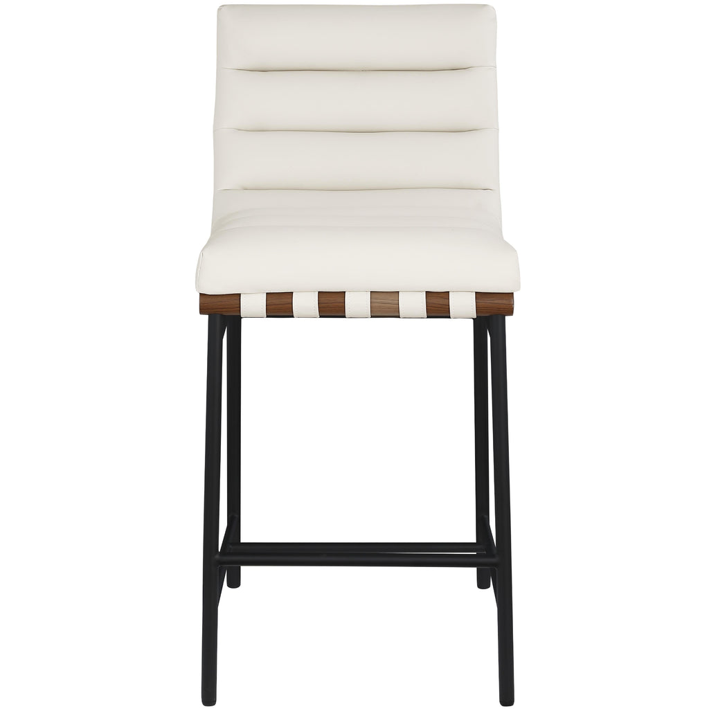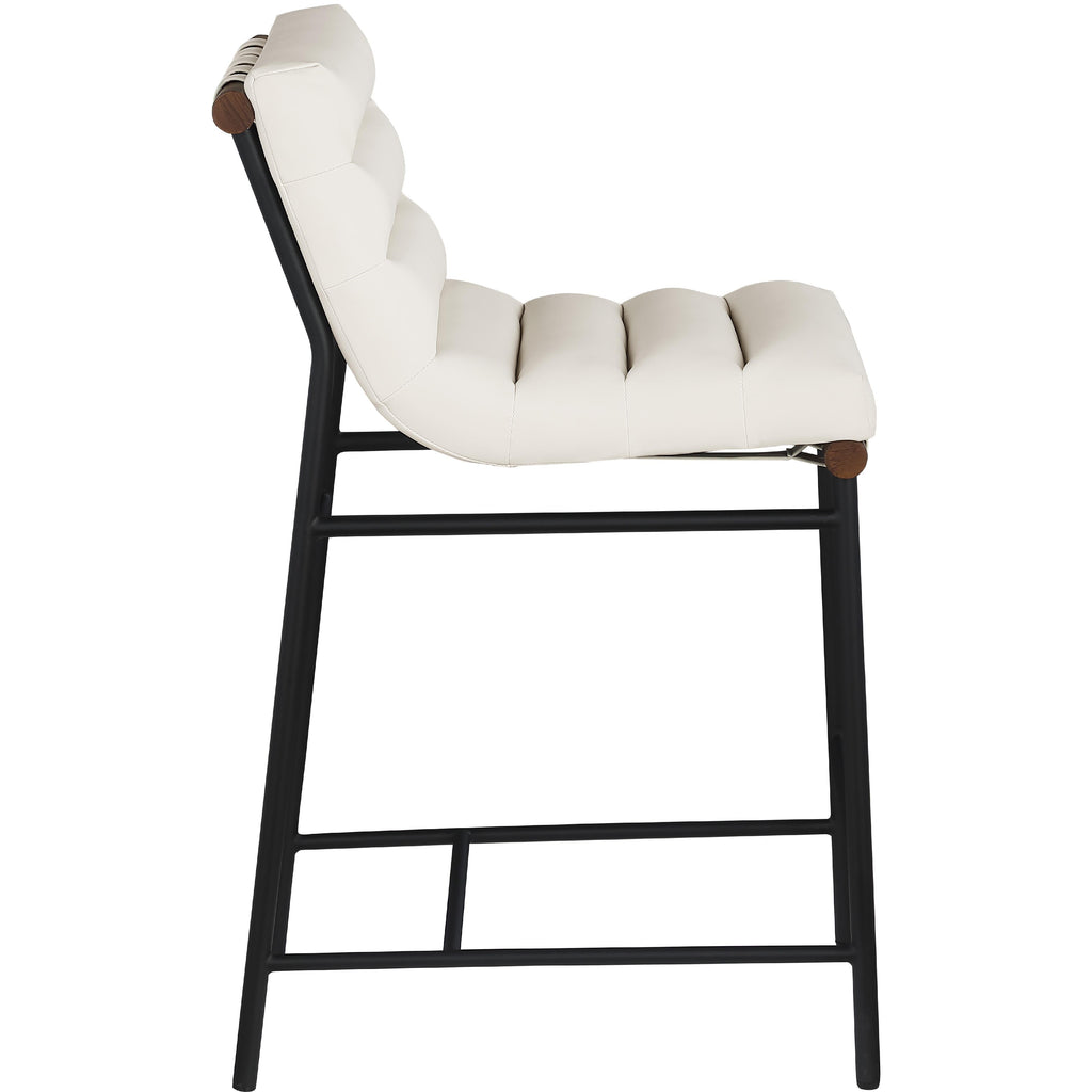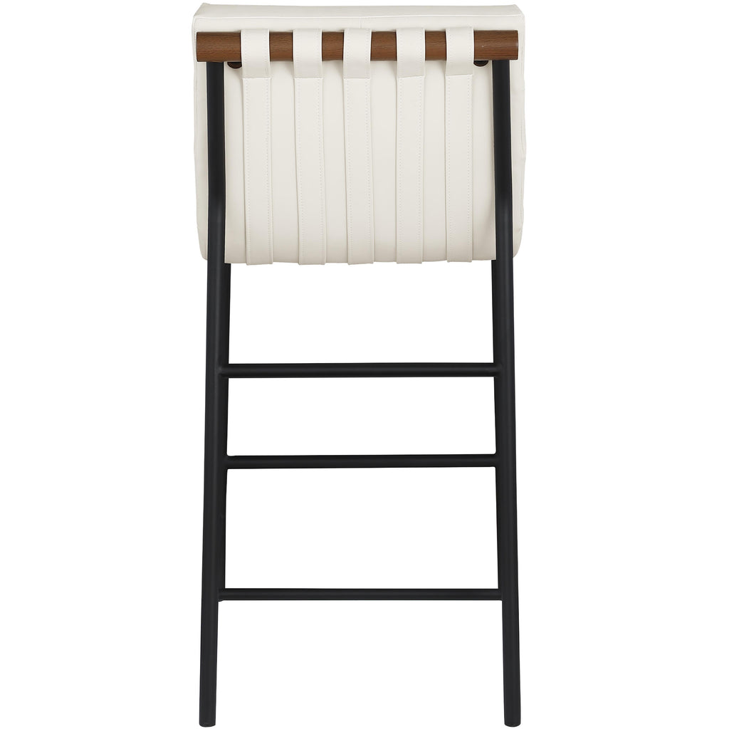 Whether at the home bar or the kitchen counter, this Burke cream vegan leather counter stool keeps guests comfortable while noshing on pancakes or sipping frosty beverages. Upholstered in soft cream vegan leather with cream vegan leather straps, this handsome counter stool makes guests want to stay till closing time. This counter-height stool has a matte black metal frame for sturdy support and a walnut wood veneer metal dowel for an added touch of stylishness. The vegan leather seat is easy to clean and maintain, so the stool keeps its beautiful look longer.
