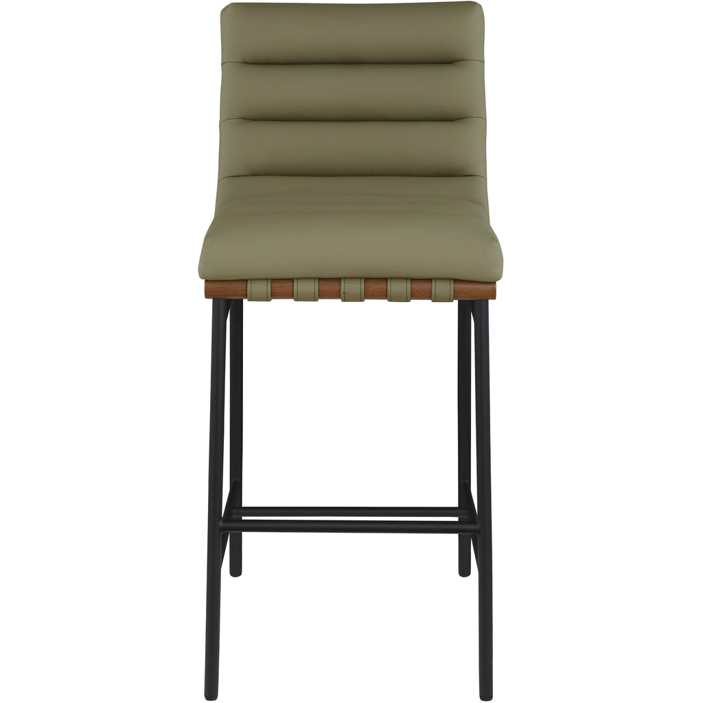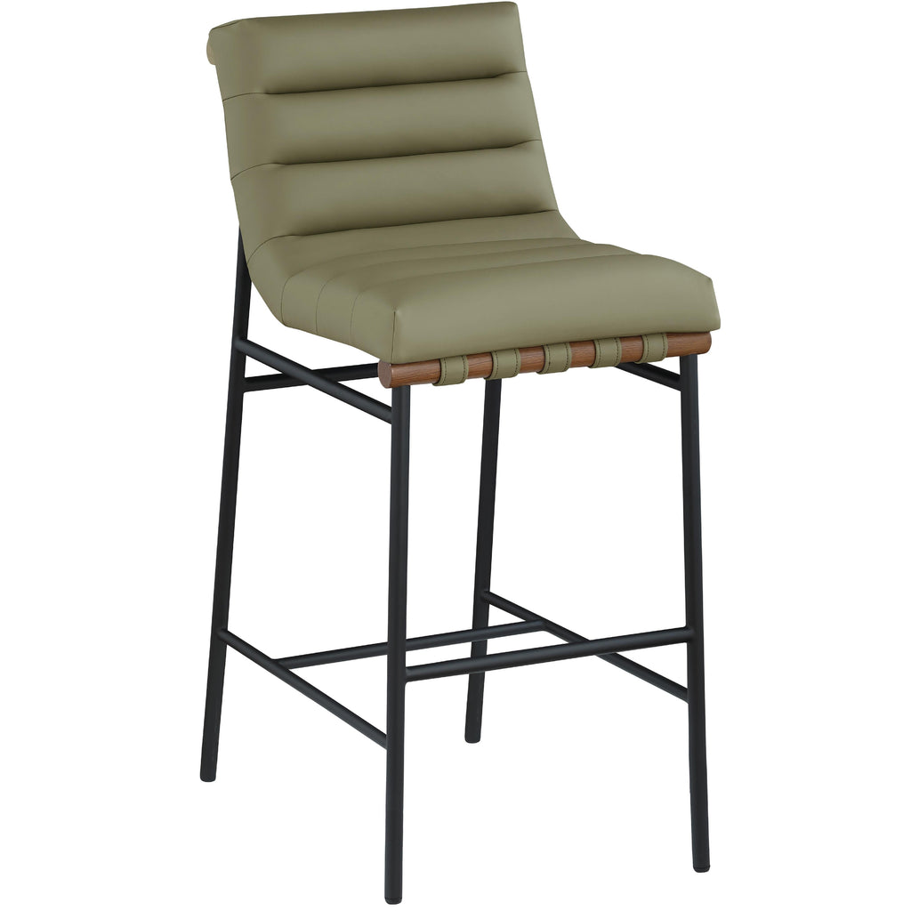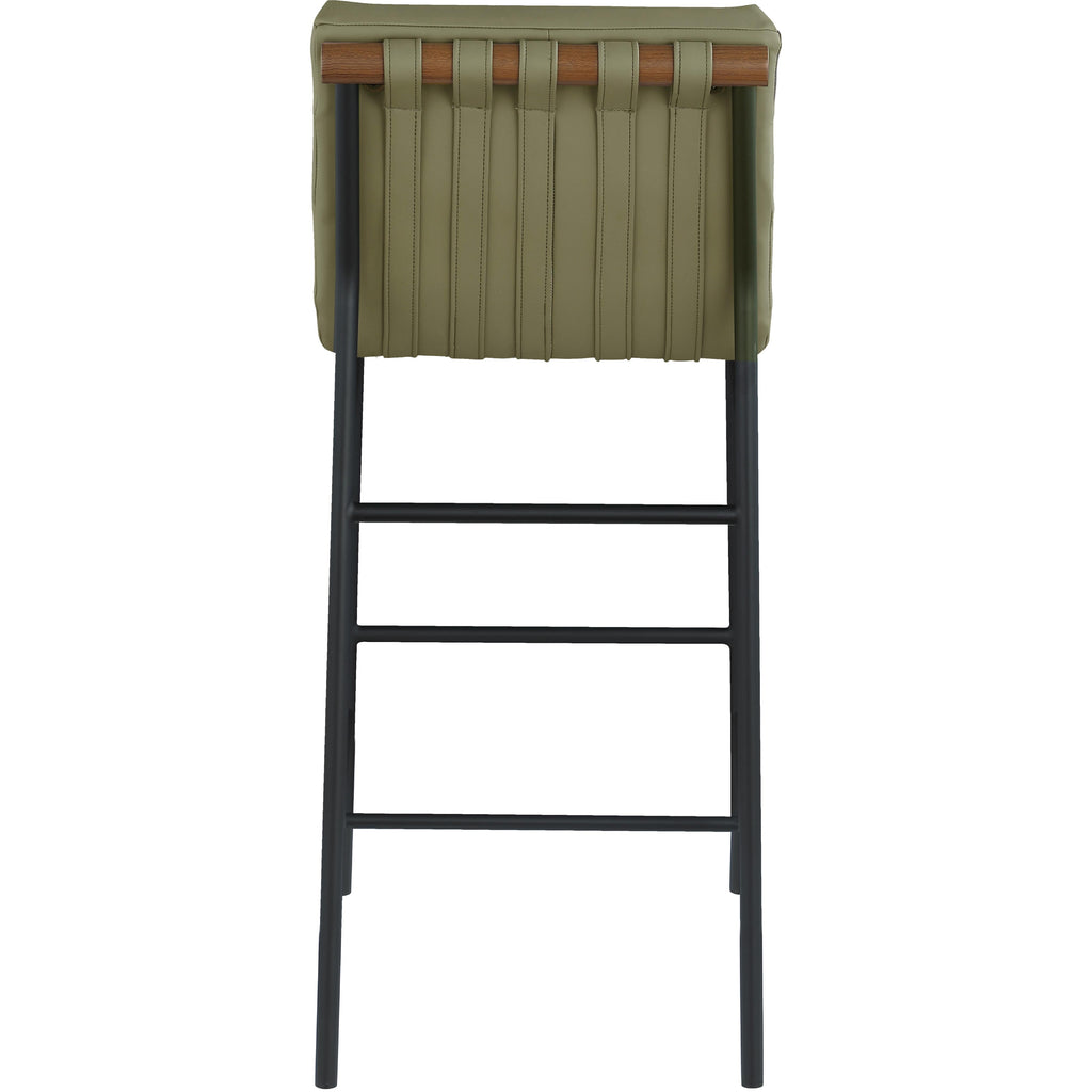Whether at the home bar or the kitchen counter, this Burke olive vegan leather bar stool keeps guests comfortable while noshing on pancakes or sipping frosty beverages. Upholstered in soft olive vegan leather with olive vegan leather straps, this handsome bar stool makes guests want to stay till closing time. This bar-height stool has a matte black metal frame for sturdy support and a walnut wood veneer metal dowel for an added touch of stylishness. The vegan leather seat is easy to clean and maintain, so the stool keeps its beautiful look longer.
