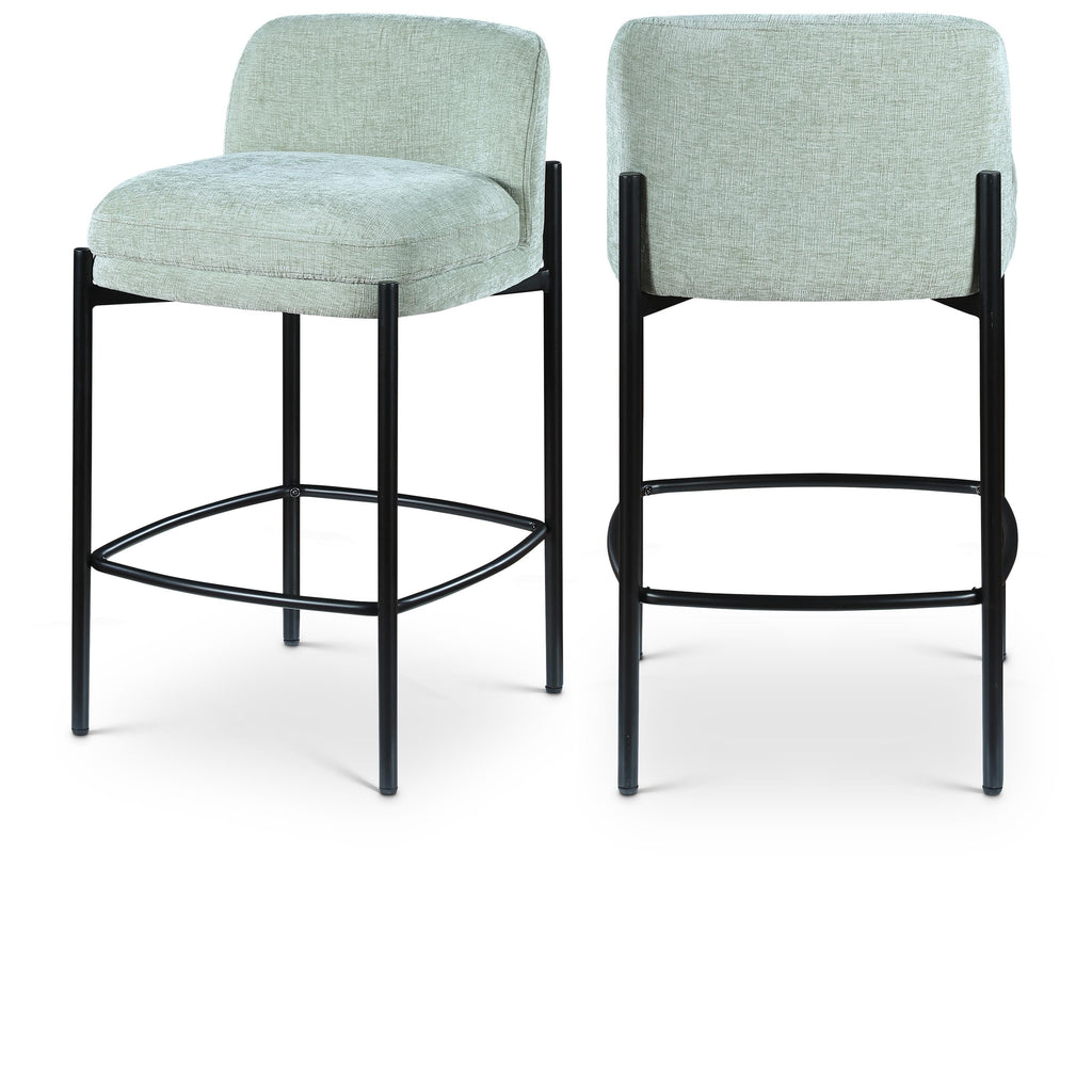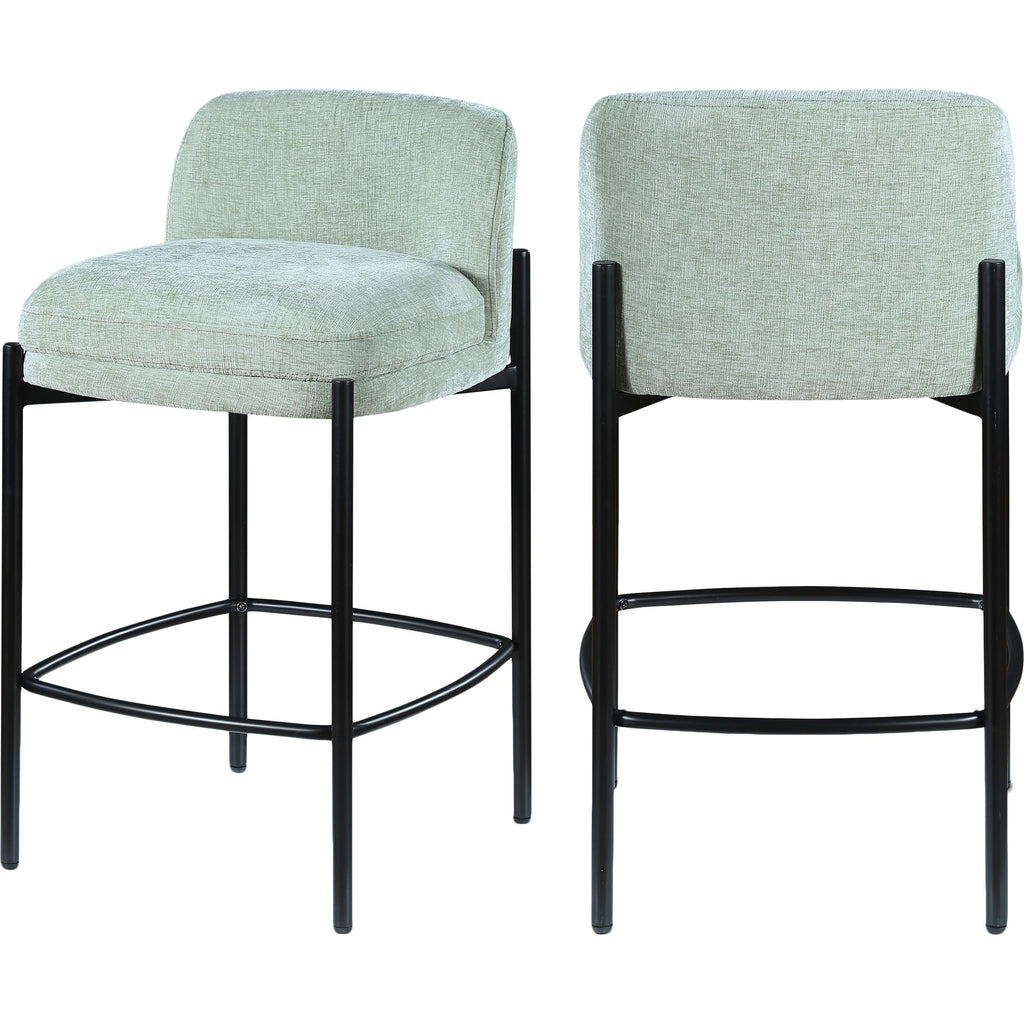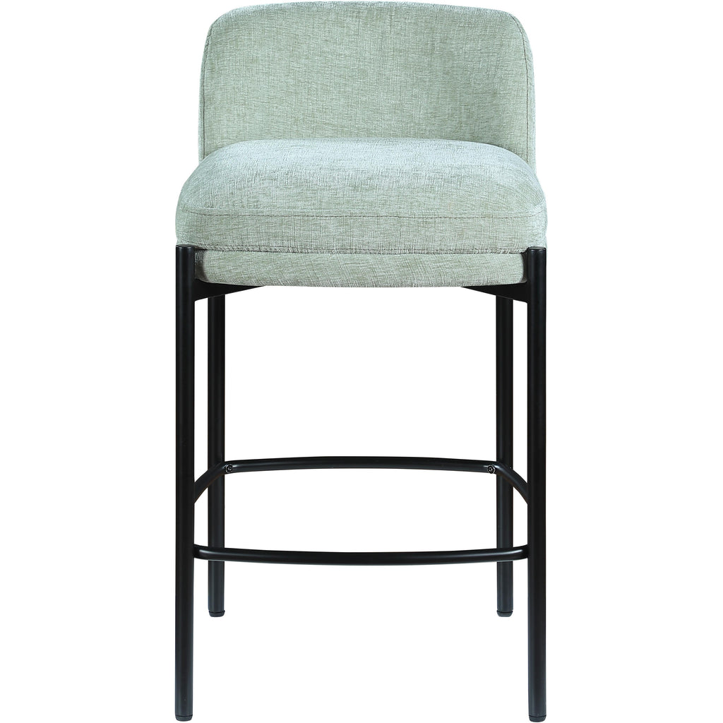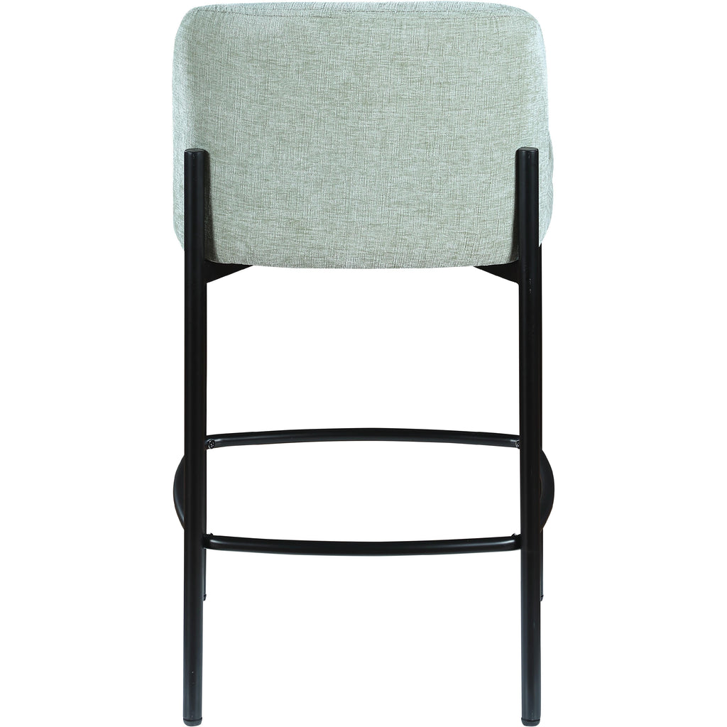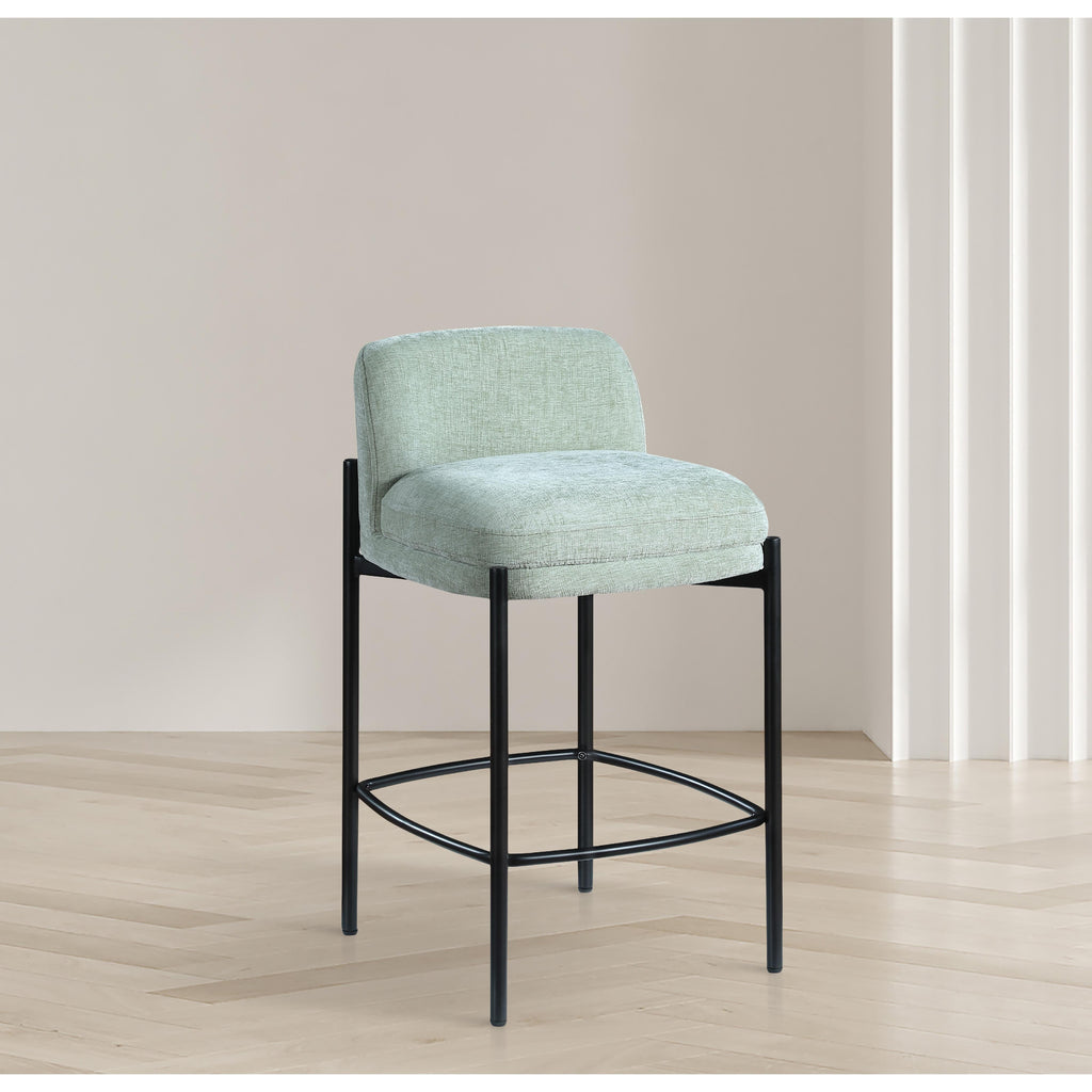 Make your kitchen counter or home bar your family's favorite spot to be with these mint Burton chenille fabric bar/counter stools. Each stool boasts soft mint chenille fabric and a sturdy matte black metal frame, ensuring both comfort and durability. A footrail across the bottom adds to the comfort factor of these handsome stools. Sold in sets of two per carton, these counter stools offer stylish and functional seating while infusing your space with a chic and modern touch.
