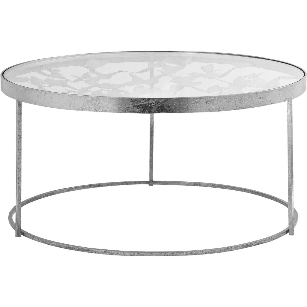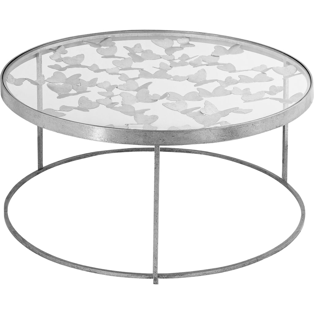 Flutter by, butterfly. Such is the sentiment when you bring home this lovely Butterfly coffee table from Meridian Furniture. A lovely silver foil design across the top of the table featuring a bevy of butterflies adds instant visual appeal to your space. The glass preserves the look of the butterflies below while the metal legs provide a sturdy framework for this long-lasting accent table. Pair it with other items in the Butterfly collection for a complete look.