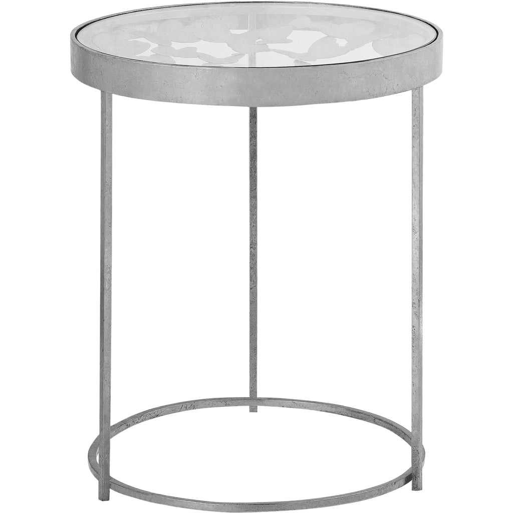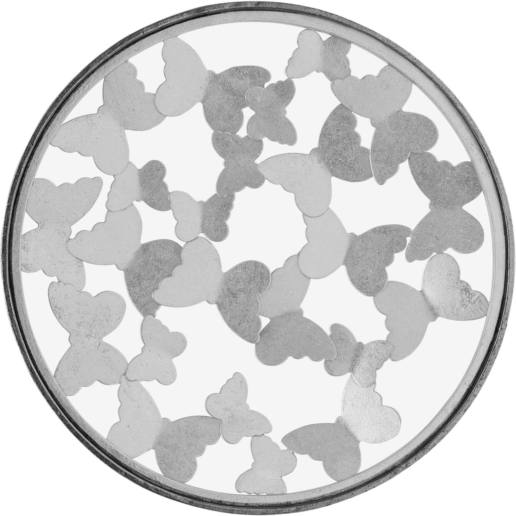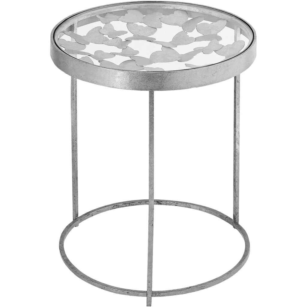 Flutter by, butterfly. Such is the sentiment when you bring home this lovely Butterfly end table from Meridian Furniture. A lovely silver foil design across the top of the table featuring a bevy of butterflies adds instant visual appeal to your space. The glass preserves the look of the butterflies below while the metal legs provide a sturdy framework for this long-lasting accent table. Pair it with other items in the Butterfly collection for a complete look.