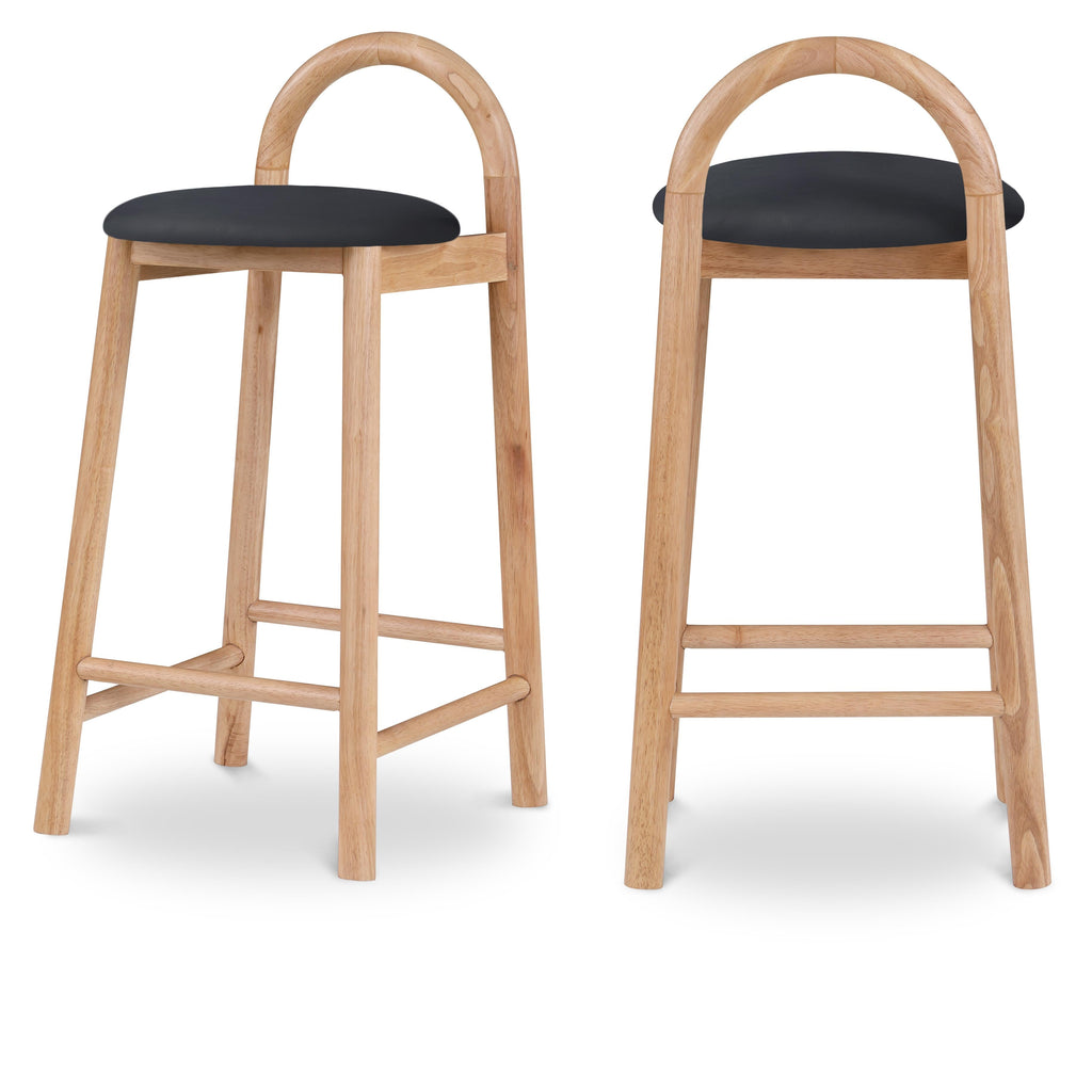 Make them want to stay 'till closing time when you add one or more of these Calvin vegan leather counter stools to your home bar or kitchen counter. These handsomely rugged stools have an uber modern look to them, making them well at home in a variety of decorative settings. The black vegan leather seat is soft and comfy, so folks want to sit a spell and enjoy themselves. The natural finish solid wood frame is durable and sturdy, and there's room to rest your feet around the bottom perimeter for added usability and comfort.