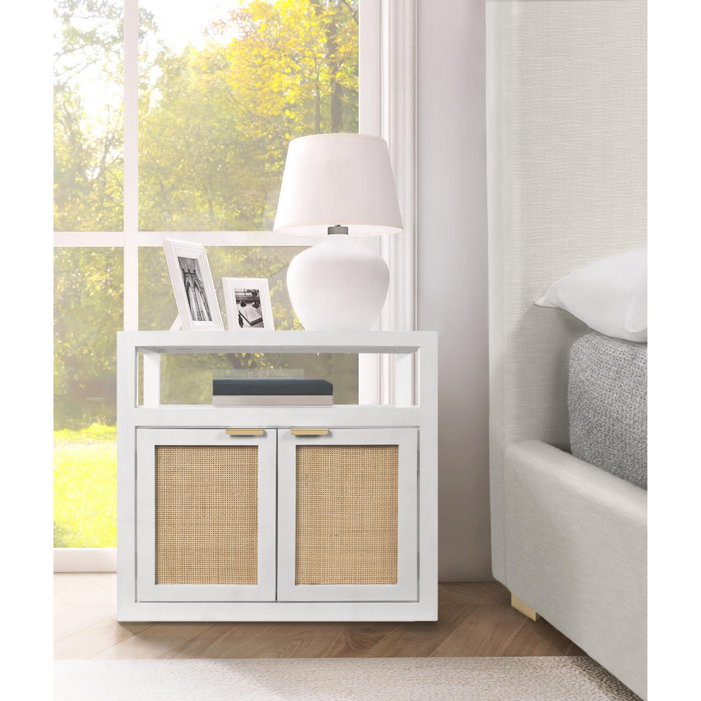 Modernize your bedroom with this Cambria white nightstand. Its natural cane top and drawer front complements its white finish, making it a fashionable piece to have next to your bed. Its wood construction is both durable and stable, so you can enjoy this nightstand for years. It includes a complete set of brass and chrome handles to match your existing decor, making it a versatile piece that you can adjust to match your room's color scheme.