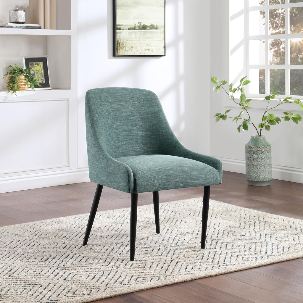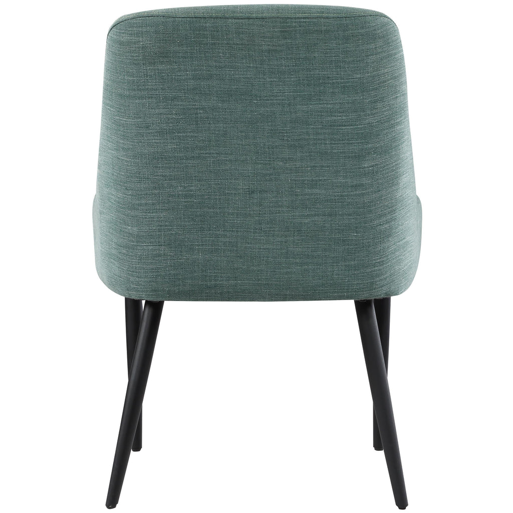 Give dinner guests the VIP treatment with this beautiful Camden dining chair. Fully upholstered from back to seat in rich green linen textured fabric and heavily padded, this chair offers the comfort your guests need to feel at home and enjoy themselves. Matte black all-metal legs provide sturdy durability to this beautiful dining chair, making it a fabulous addition to your contemporary dining room. Pair it with your table of choice for a custom look that wows.