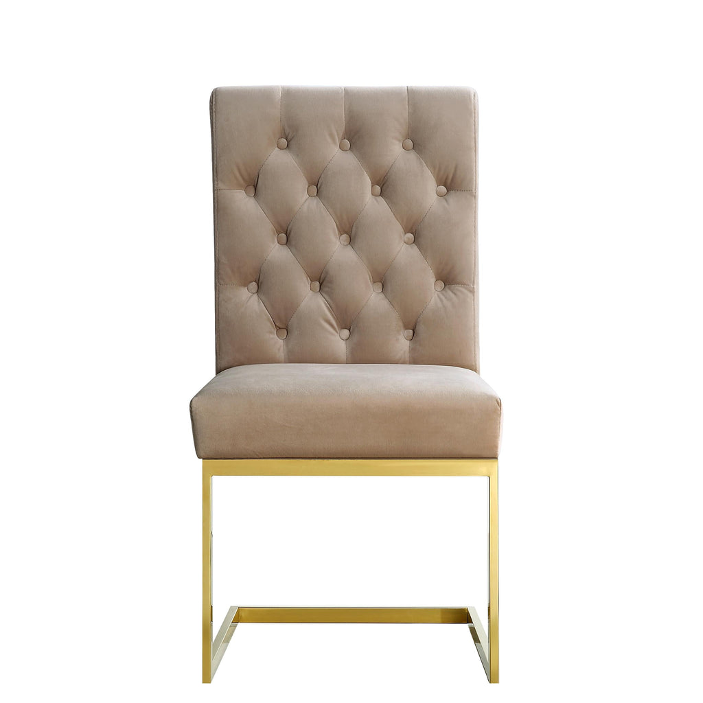 Sit at the dinner table in utmost comfort and style with the Cameron beige velvet dining chair. Featuring an open contemporary design, rich tufted velvet upholstery and a rich gold finish stainless steel base, this dining chair offers a comfortable place for you to sit and break bread with your family or a group of friends. Its rich beige color adds a contemporary splash of color to your dining furniture set.