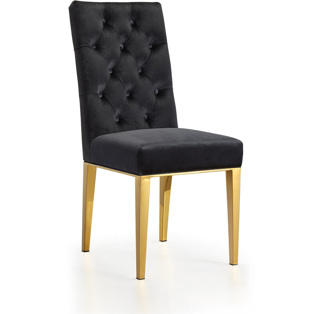 Turn to these Capri black velvet dining chairs for a modern look in your contemporary dining space. This chair features a classic parsons design with a slightly slanted back that's button tufted to give it a textural look. The legs are made from stainless steel to give them strength and added support as you sit, and they're finished in a rich gold tone hue for a regal and sophisticated look.
