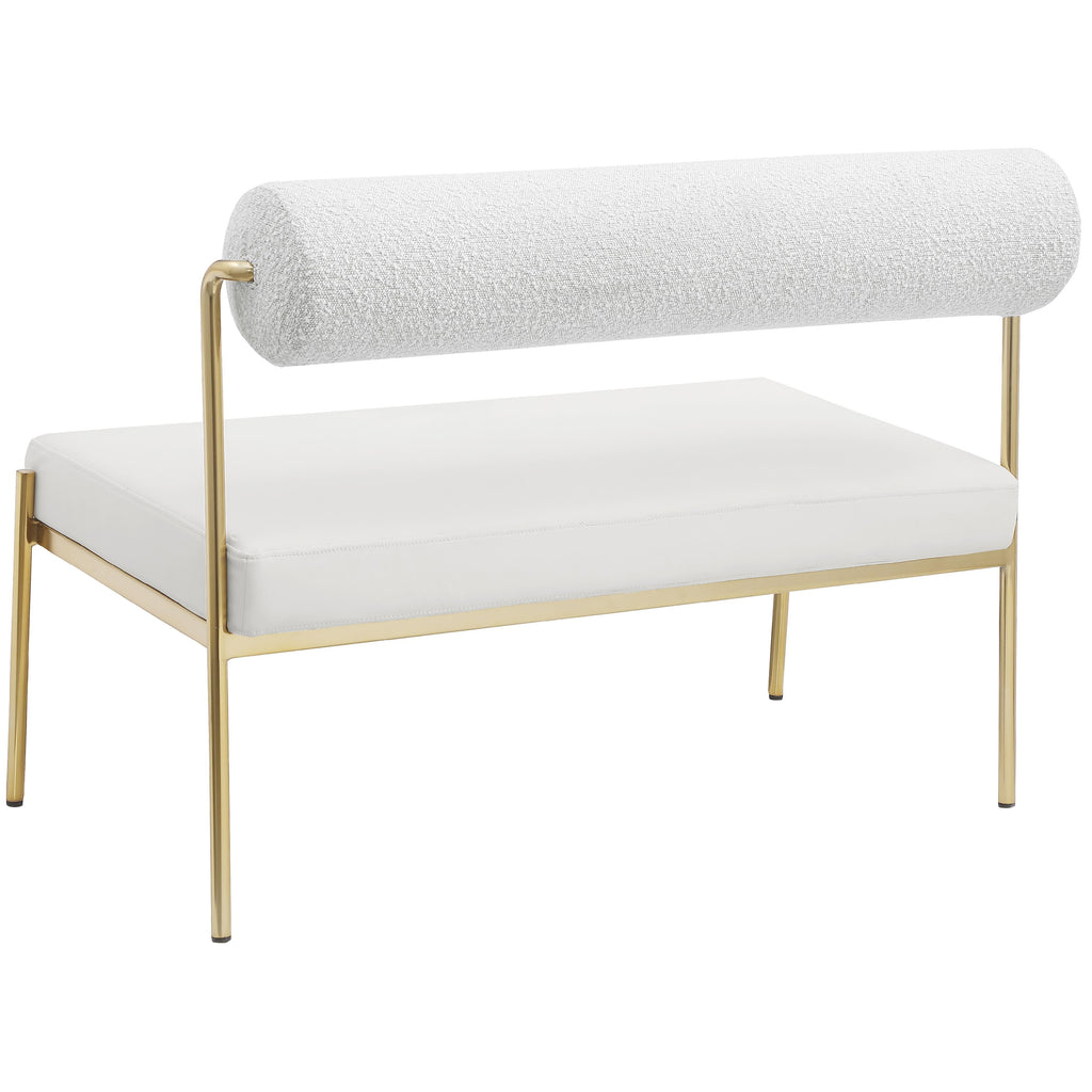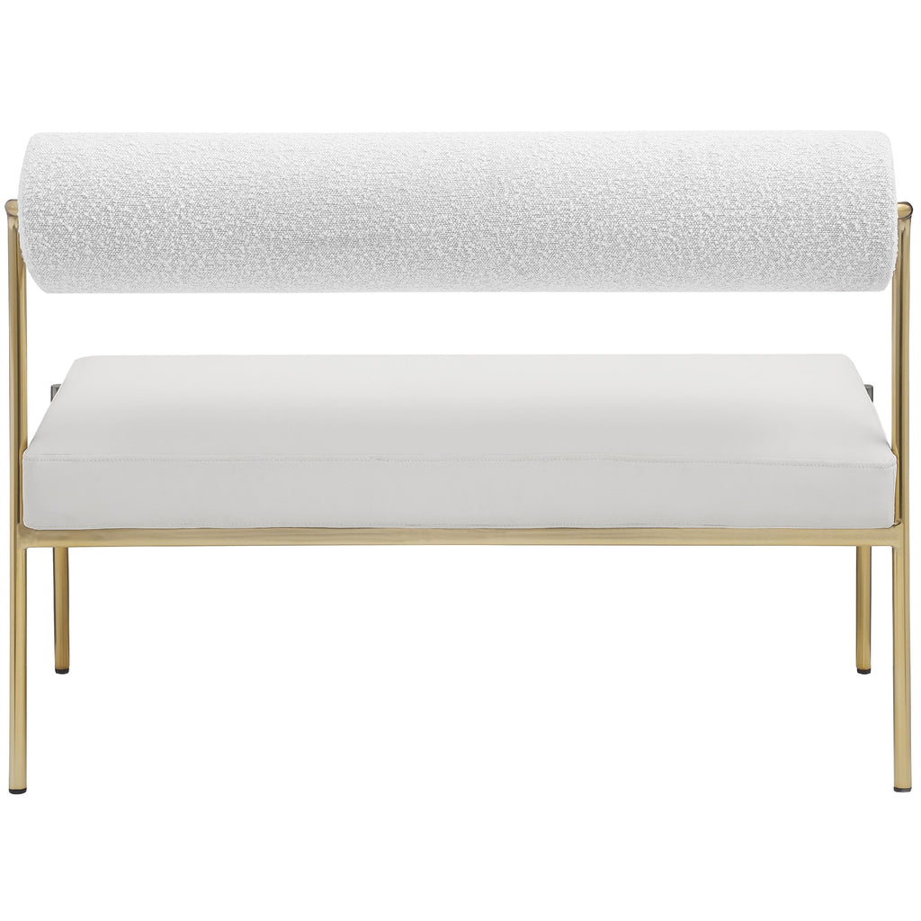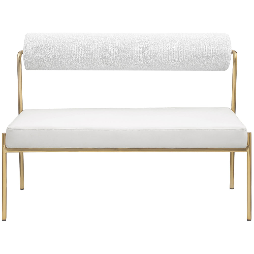 Transform your dining area with this Carly cream vegan leather seat/boucle fabric back bench. Its cream vegan leather seat provides you with a soft place to sit, while its rich cream boucle back amps up the comfort level an extra notch. Its brushed brass iron frame ensures stability and durability, so you can enjoy this bench for years to come. This bench is perfect for any home featuring a contemporary design.