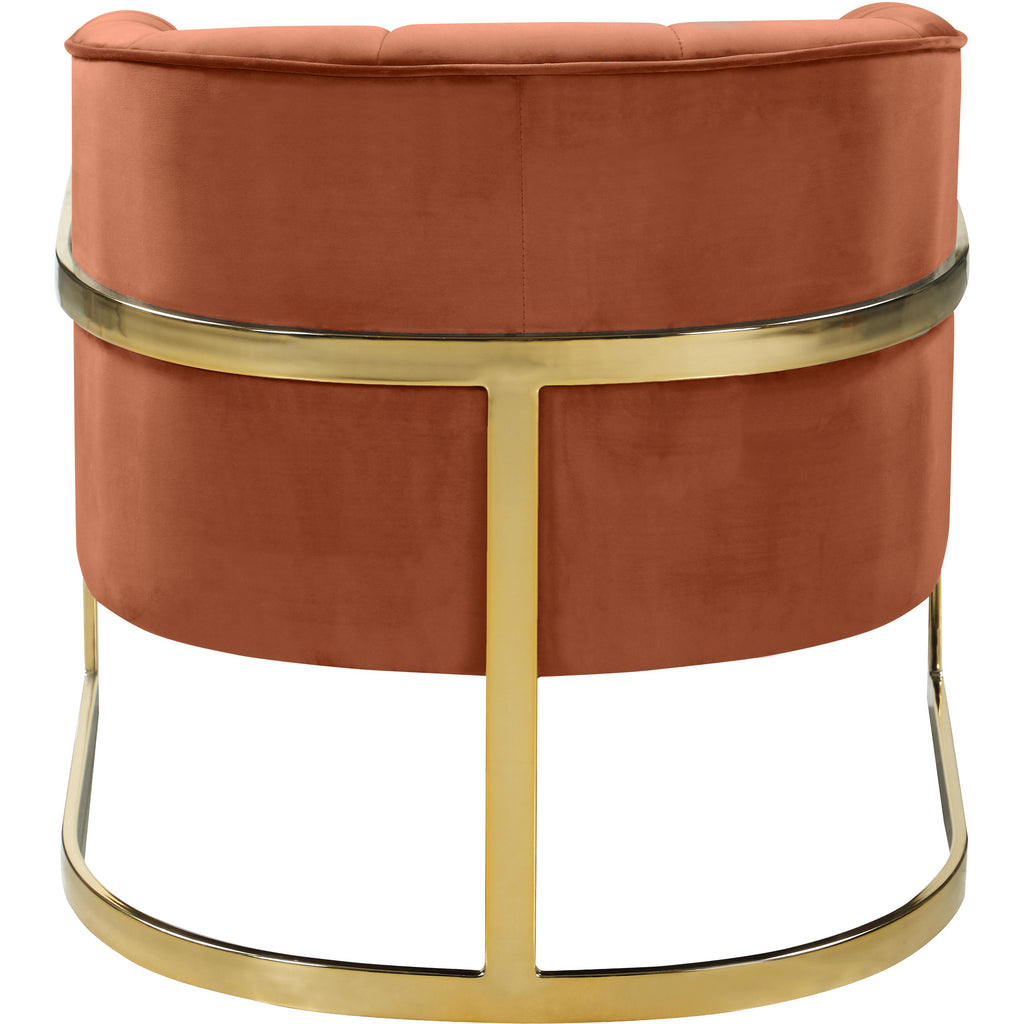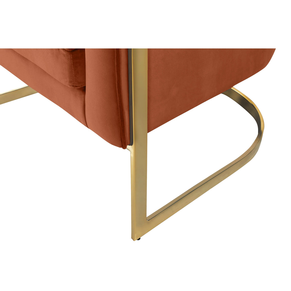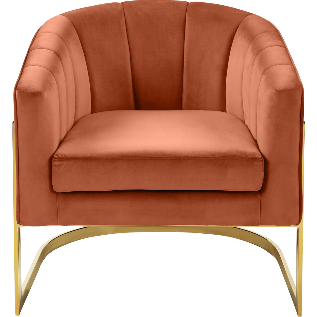 Add a touch of modern drama to your space with this Carter Cognac Velvet Accent Chair from Meridian Furniture. This chair offers a super plush cushion that cradles your body in exquisite comfort as you sit, making it easily become your favorite spot in the house. Tufted channels on the arms and back add a textured feel to the chair, and it's upholstered in cognac velvet, so it's soft and supple against the skin. The stainless steel base is finished in gold, adding to its elegant demeanor for your modern home.