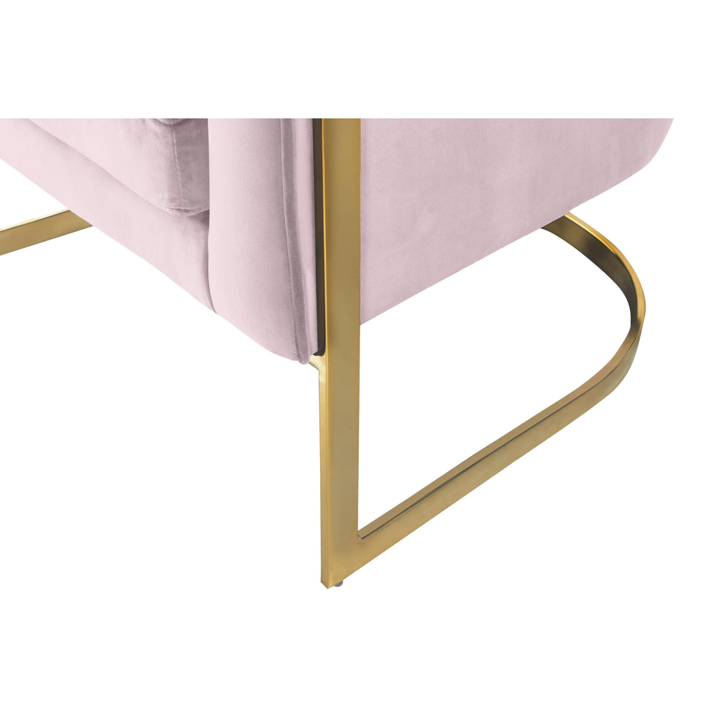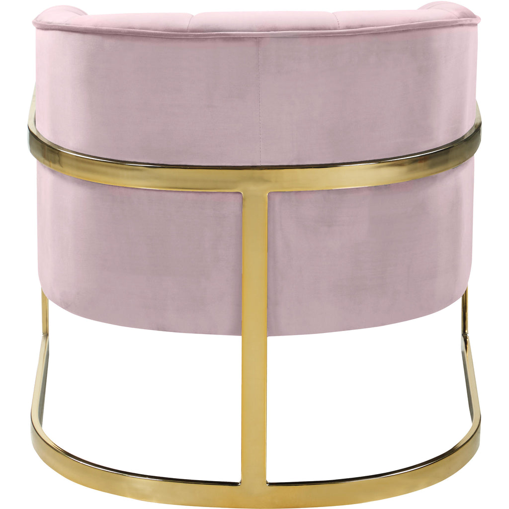 Add a touch of modern drama to your space with this Carter Pink Velvet Accent Chair from Meridian Furniture. This chair offers a super plush cushion that cradles your body in exquisite comfort as you sit, making it easily become your favorite spot in the house. Tufted channels on the arms and back add a textured feel to the chair, and it's upholstered in pink velvet, so it's soft and supple against the skin. The stainless steel base is finished in gold, adding to its elegant demeanor for your modern home.