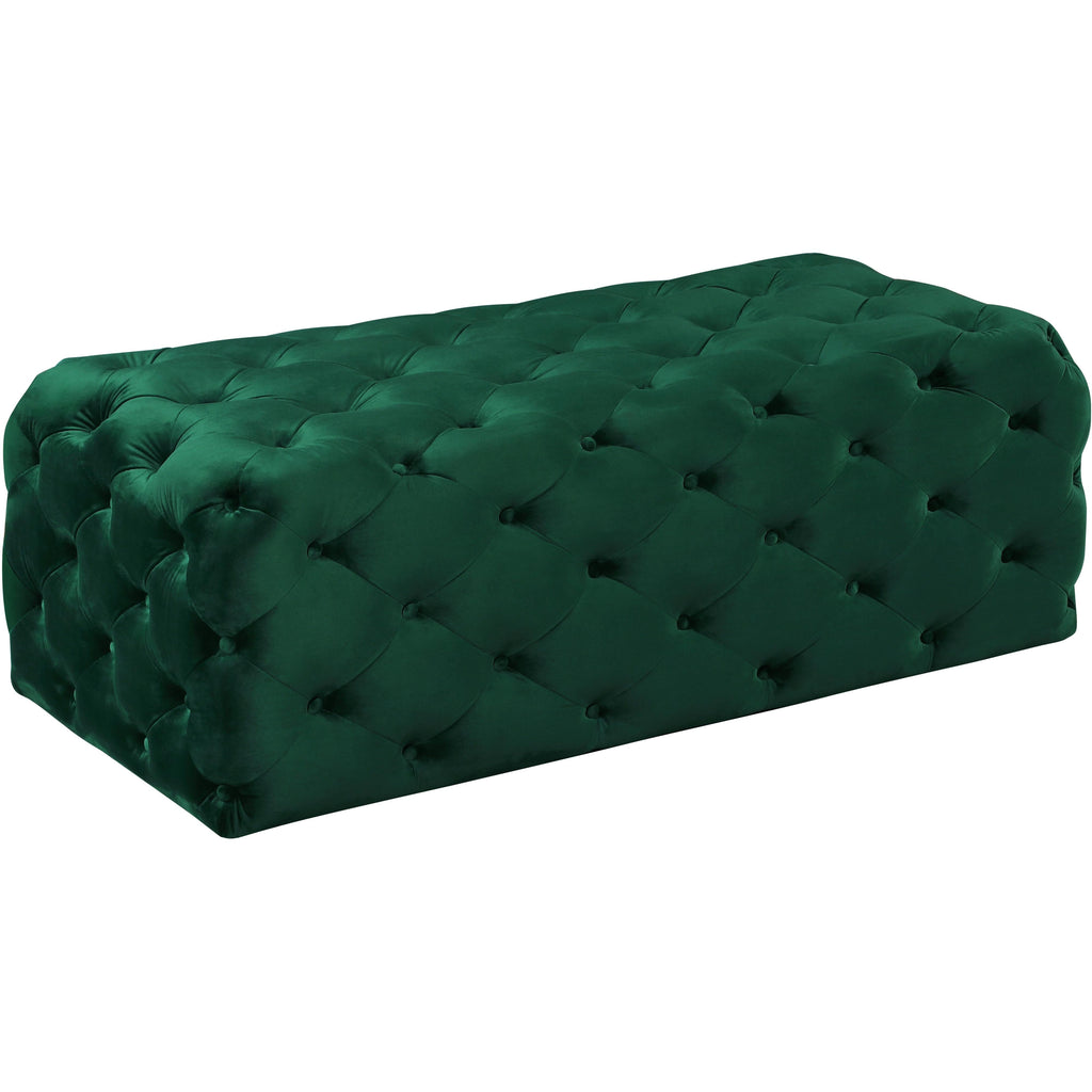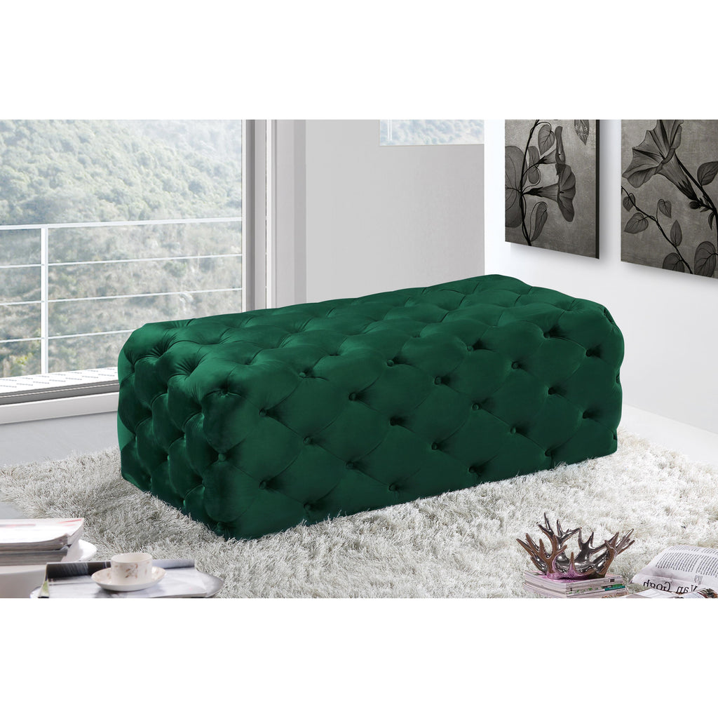 Prop your feet up and get comfy with the Casey green velvet ottoman. This elegant ottoman features a glamorous design with heavy tufting from top to bottom, giving it a sophisticated, upscale look. The padding beneath its velvet upholstery is plump and thick, so your feet and lower legs sink into it in lavish comfort. Buy it on its own, or pair it with other items in the collection for a coordinated vibe in your space.