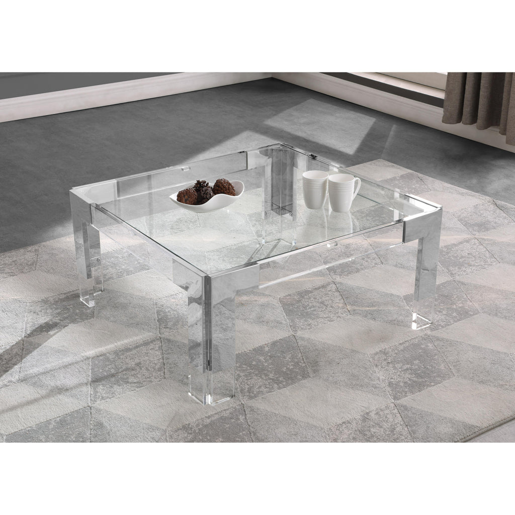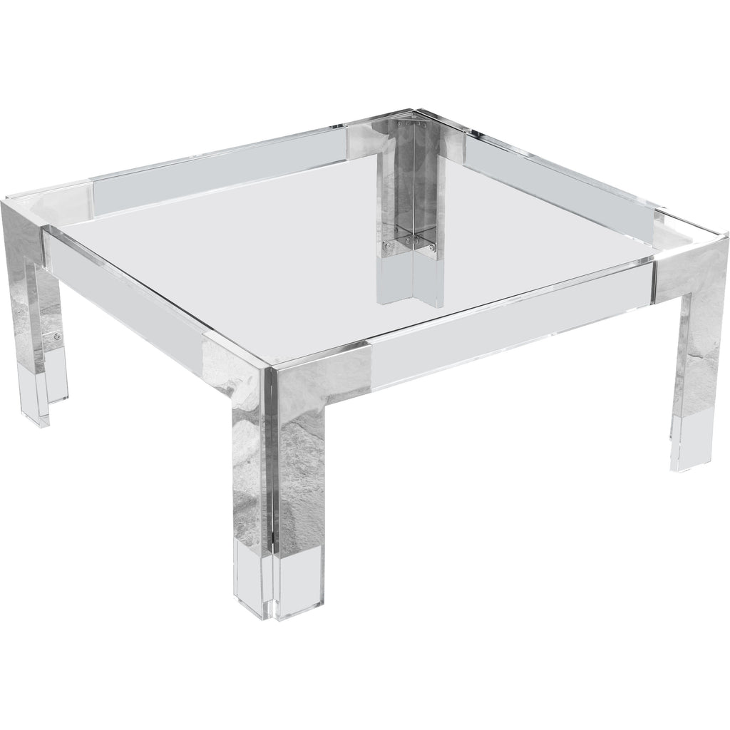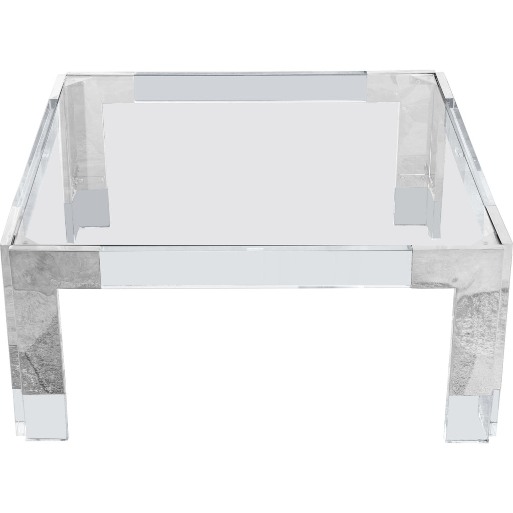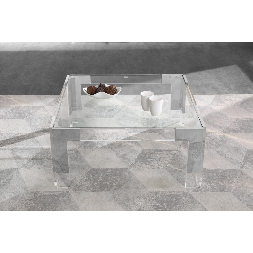 Count on this Casper square coffee table to rev up the contemporary look of your home. The beautiful clear glass top lets the beauty of the wood shine through. Clear acrylic feet and chrome stainless steel accents lend the table a rich look. Insert this table in your living room, den, or family room to enjoy an attractively artistic spot to rest books, magazines, and beverages.