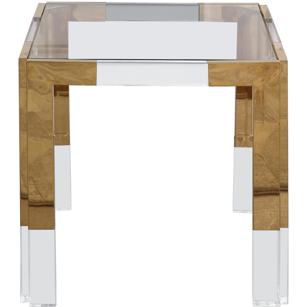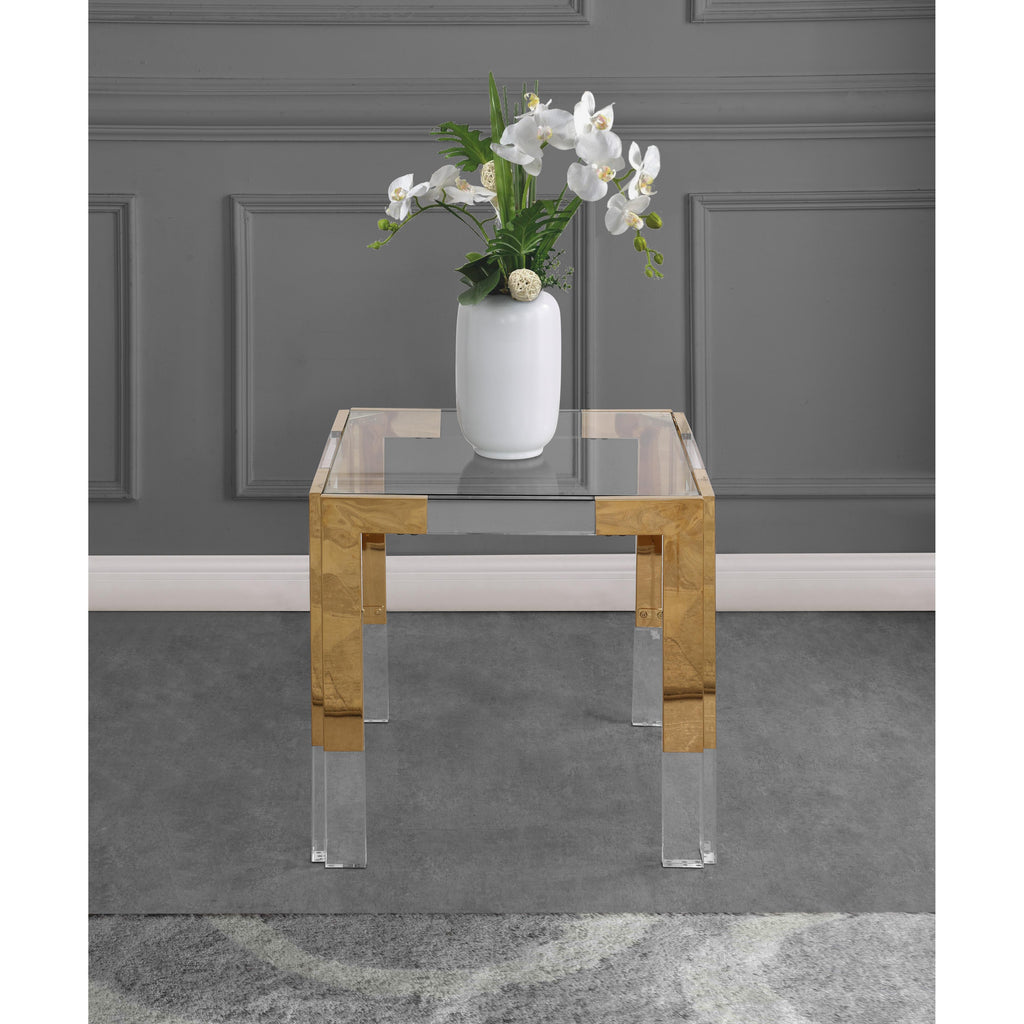 Count on this Casper square end table to rev up the contemporary look of your home. The beautiful clear glass top lets the beauty of the wood shine through. Clear acrylic feet and gold stainless steel accents lend the table a rich look. Insert this table in your living room, den, or family room to enjoy an attractively artistic spot to rest books, magazines, and beverages.