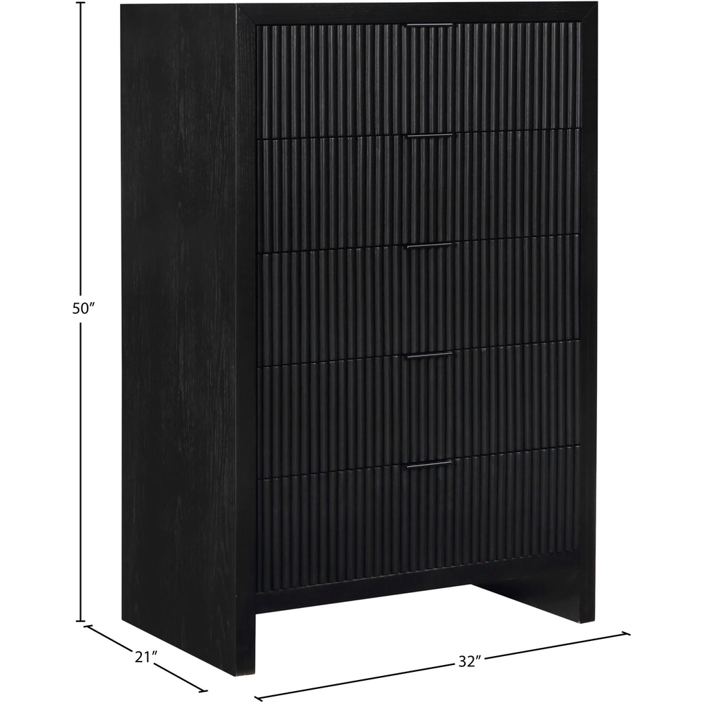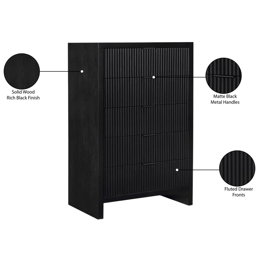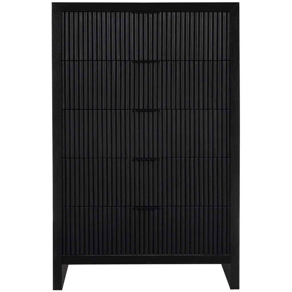 The exquisite Fairfax Chest is a perfect blend of style and functionality. The meticulously crafted fluted drawer fronts, with their subtle grooves, lend a touch of sophistication to the piece. The matte black metal handles are not only visually appealing but also easy to grip, making it effortless to open and close the drawers. The chest is crafted from solid wood, providing a durable and sturdy construction. Its sleek black finish enhances its modern and contemporary appeal, making it an exceptional addition to any living space.
