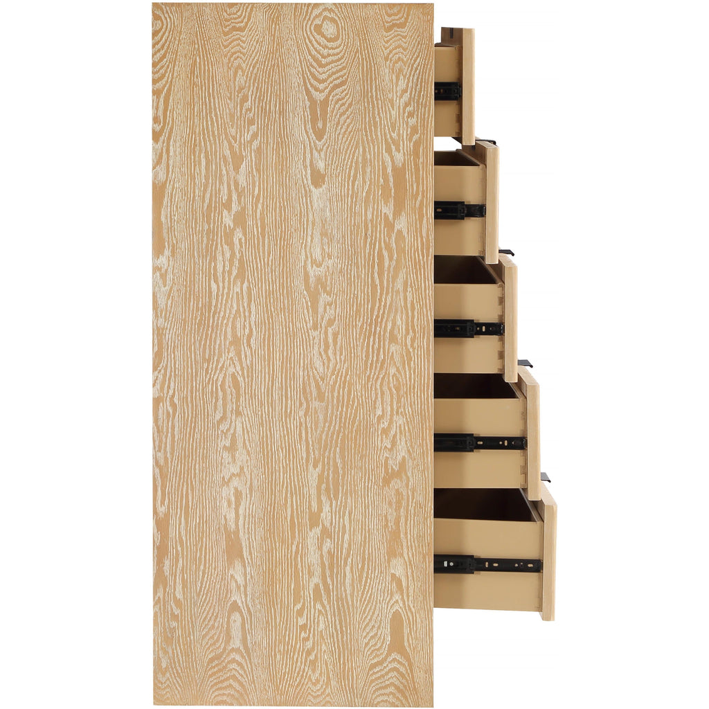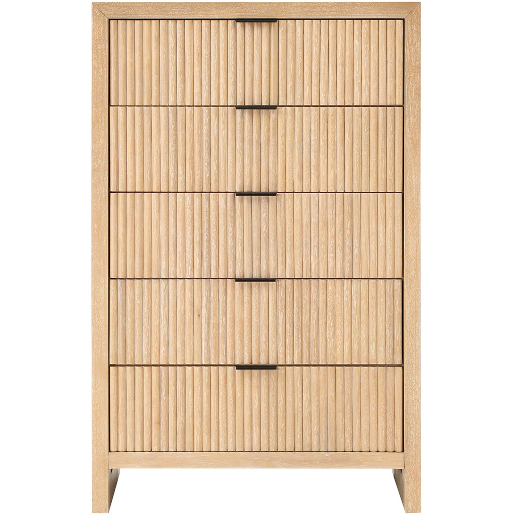 The exquisite Fairfax Chest is a perfect blend of style and functionality. The meticulously crafted fluted drawer fronts, with their subtle grooves, lend a touch of sophistication to the piece. The matte black metal handles are not only visually appealing but also easy to grip, making it effortless to open and close the drawers. The chest is crafted from solid wood, providing a durable and sturdy construction. Its sleek natural finish enhances its modern and contemporary appeal, making it an exceptional addition to any living space.