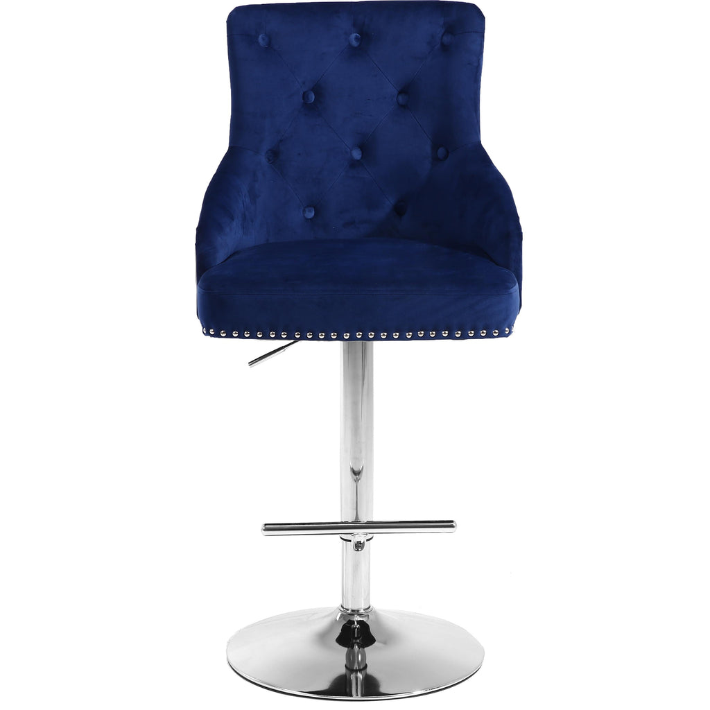 Make this Claude Navy Velvet Adjustable Stool everyone's new favorite seat. The high-back design supports guests in comfort, while rich velvet upholstery in a crisp navy color gives the stool a svelte, modern look. Chrome nailhead trim adds another level of luxury, and the tufted design enables the cushioned back to keep its loft for maximum comfort. Add it to the bar or the kitchen counter to create a modish vibe in your room.