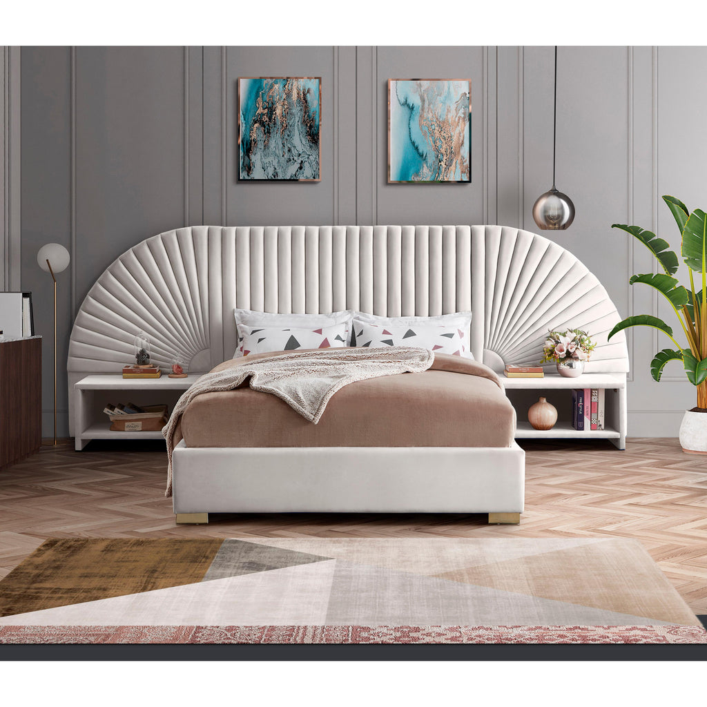 Enjoy sweet dreams in this beautiful Cleo cream velvet queen size bed. The tall, luxurious velvet headboard is upholstered in a channel-tufted style, flanked by removable fan-shaped side pieces. The footboard and rails are comfortably upholstered in soft cream velvet as well, with gold steel legs supporting the frame. Matching pieces are available in the same collection, allowing you to complete the contemporary style of this look for an elegantly glamorous bedroom.