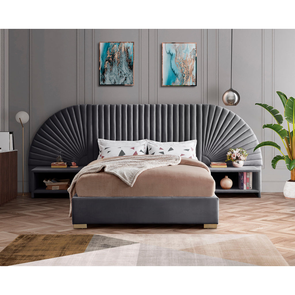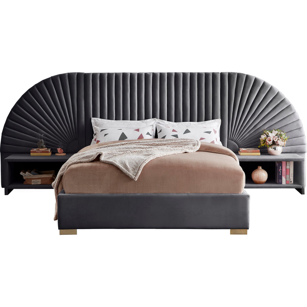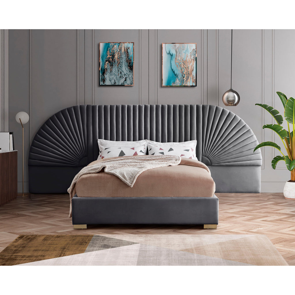 Enjoy sweet dreams in this beautiful Cleo grey velvet queen size bed. The tall, luxurious velvet headboard is upholstered in a channel-tufted style, flanked by removable fan-shaped side pieces. The footboard and rails are comfortably upholstered in soft grey velvet as well, with gold steel legs supporting the frame. Matching pieces are available in the same collection, allowing you to complete the contemporary style of this look for an elegantly glamorous bedroom.