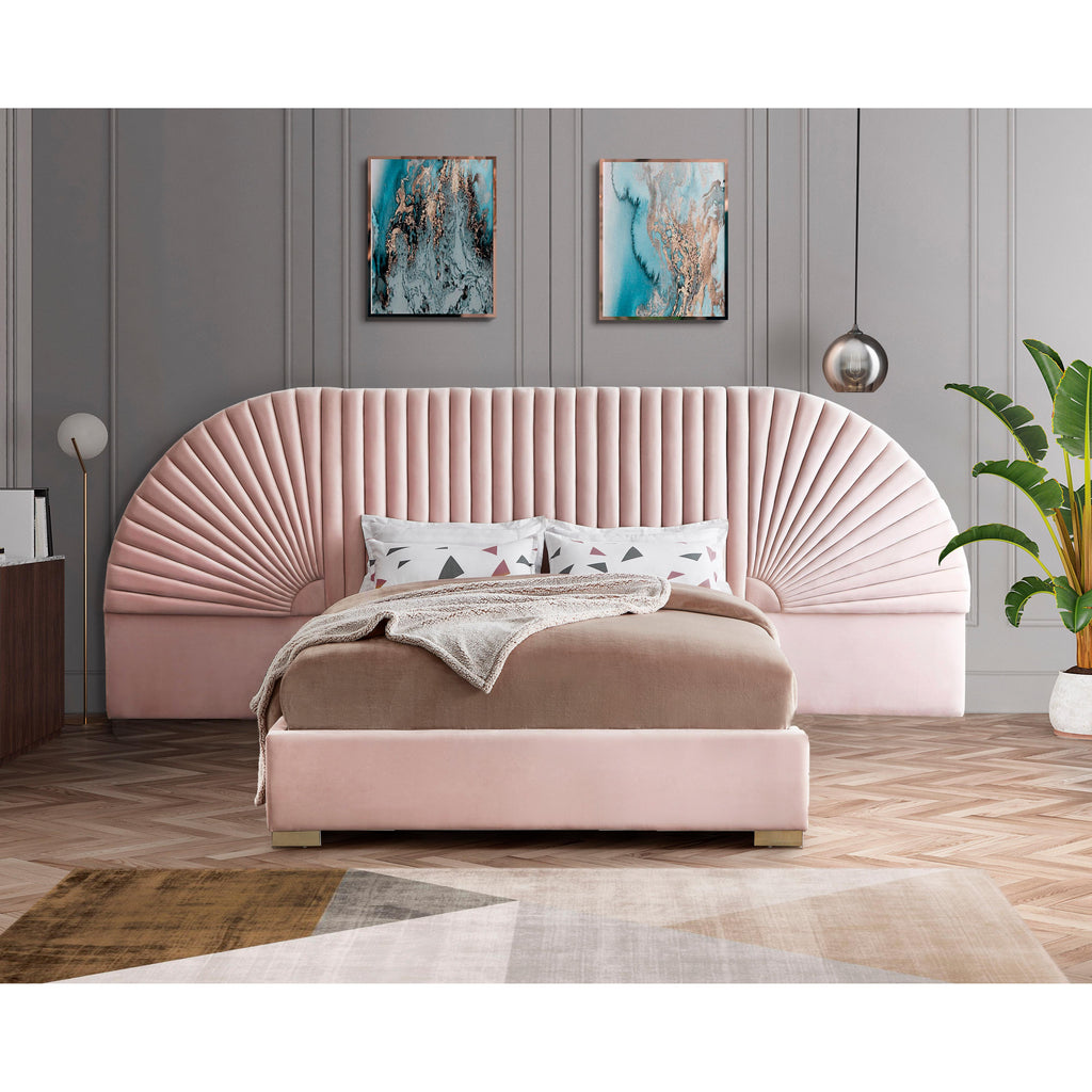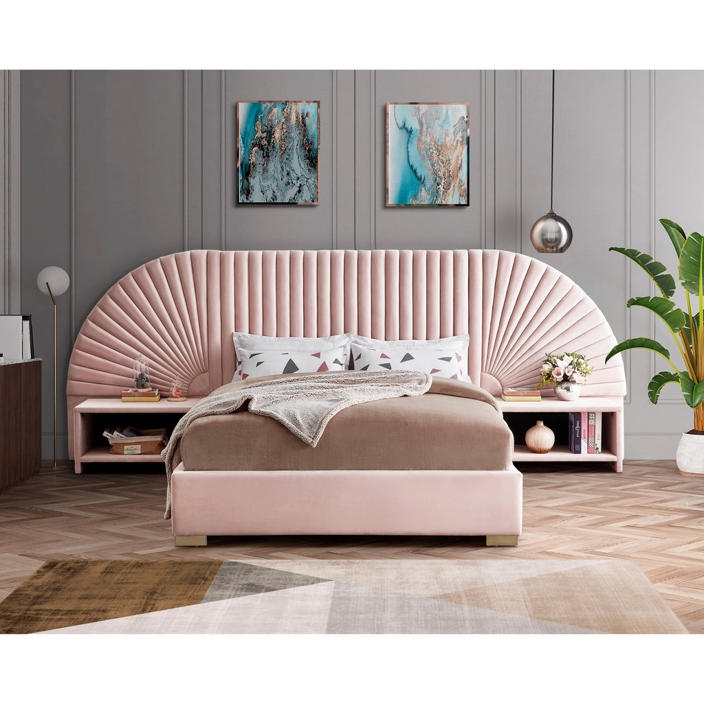 Enjoy sweet dreams in this beautiful Cleo pink velvet queen size bed. The tall, luxurious velvet headboard is upholstered in a channel-tufted style, flanked by removable fan-shaped side pieces. The footboard and rails are comfortably upholstered in soft pink velvet as well, with gold steel legs supporting the frame. Matching pieces are available in the same collection, allowing you to complete the contemporary style of this look for an elegantly glamorous bedroom.