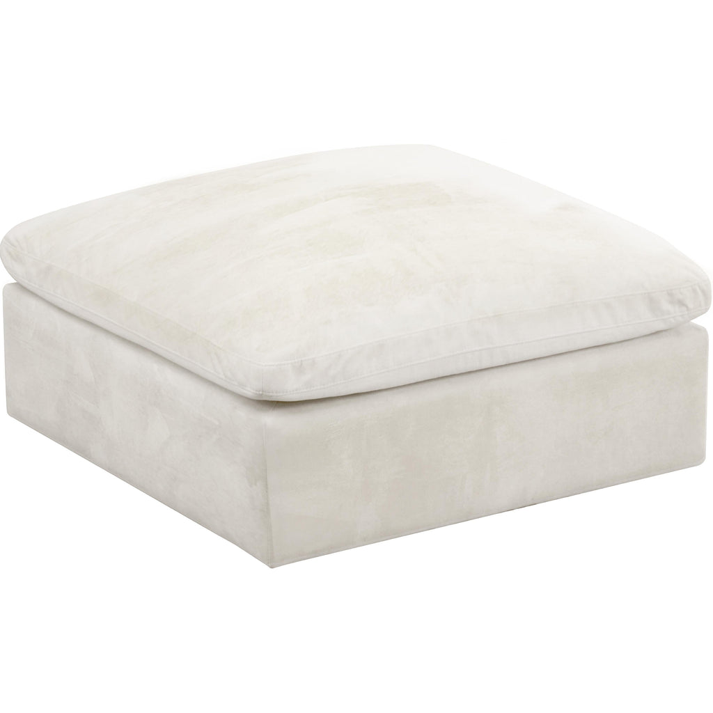 Bring home this Cozy ottoman for a fresh new look. Embrace casual elegance with this Cozy velvet cloud-like comfort modular fiber-filled option. Handsome from all angles, this piece features soft cream velvet upholstery to make it an easy fit in any room. This modular piece can be combined with other items in the Cozy collection to create a seating group of your dreams. The top on this piece is exceptionally comfortableand filled with fiber for luxury that you deserve as you rest and relax.