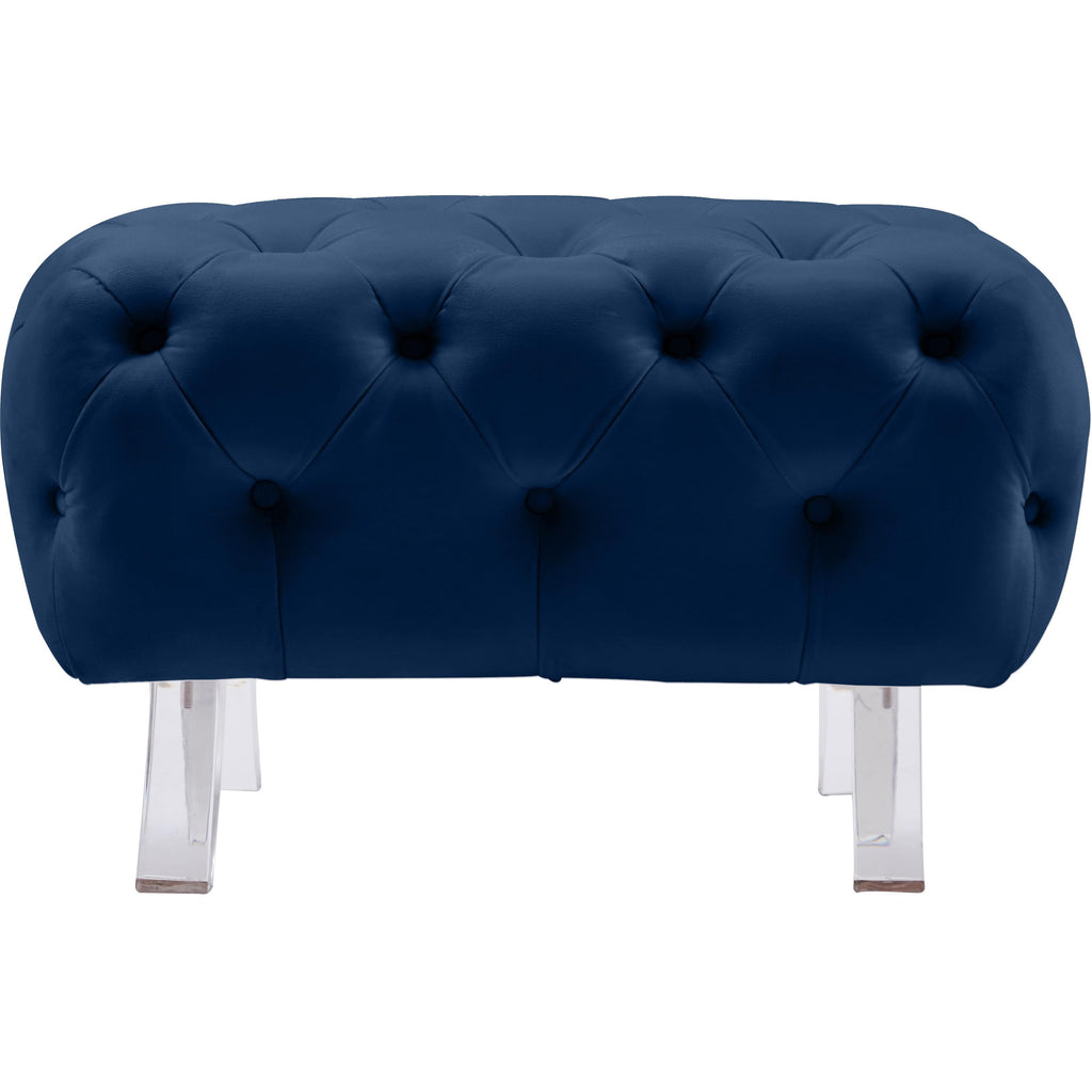 Give your room an instant update with this Crescent velvet ottoman. Uber modern by design, this space-age ottoman features a crescent shape silhouette for a look that attracts attention from all angles. Its soft navy velvet upholstery is sleek and chic to the touch and feels oh-so-soft against the skin, beckoning to visitors to sit down and stay awhile. Acrylic legs add to the ottoman's modern, contemporary vibe and give it a sturdy foundation.