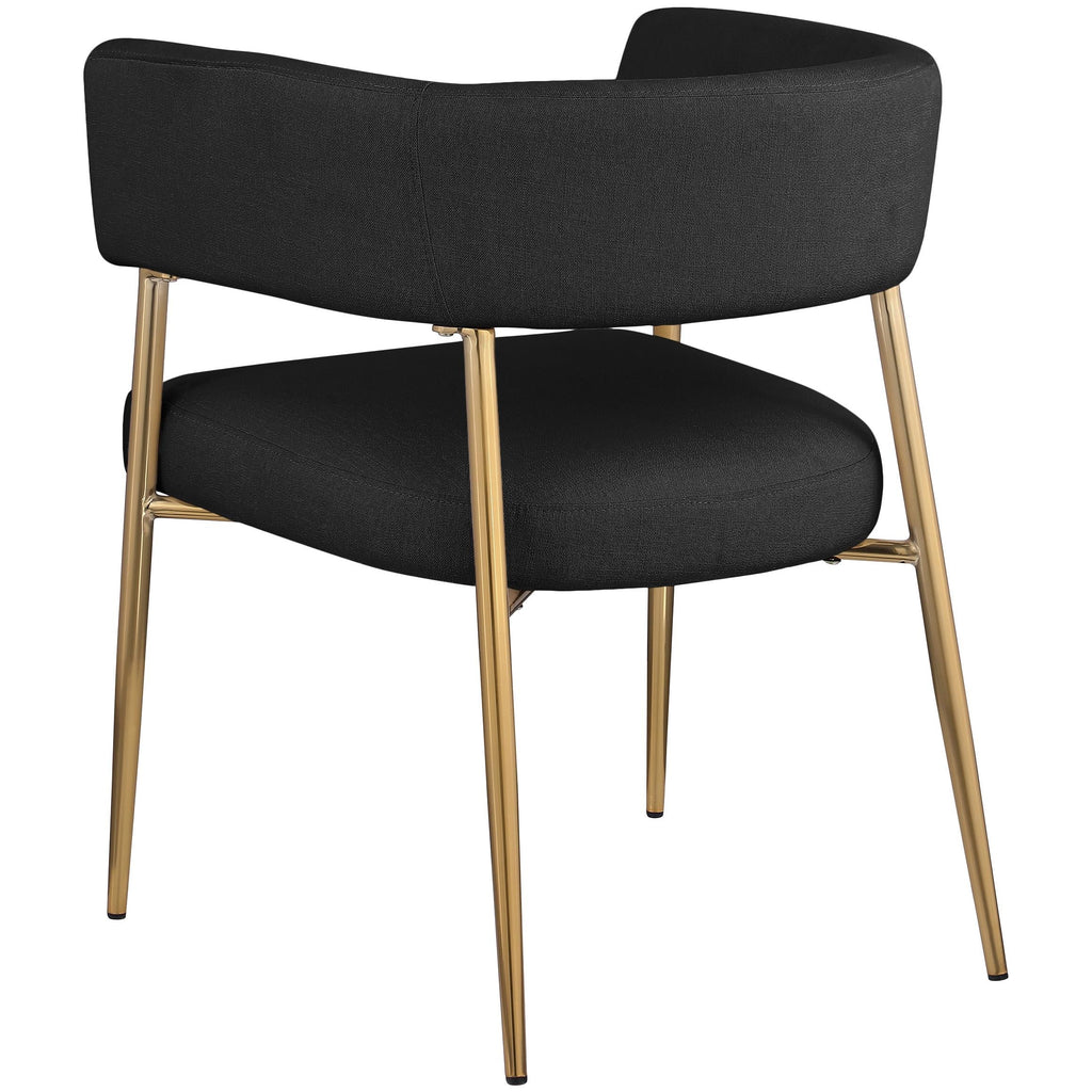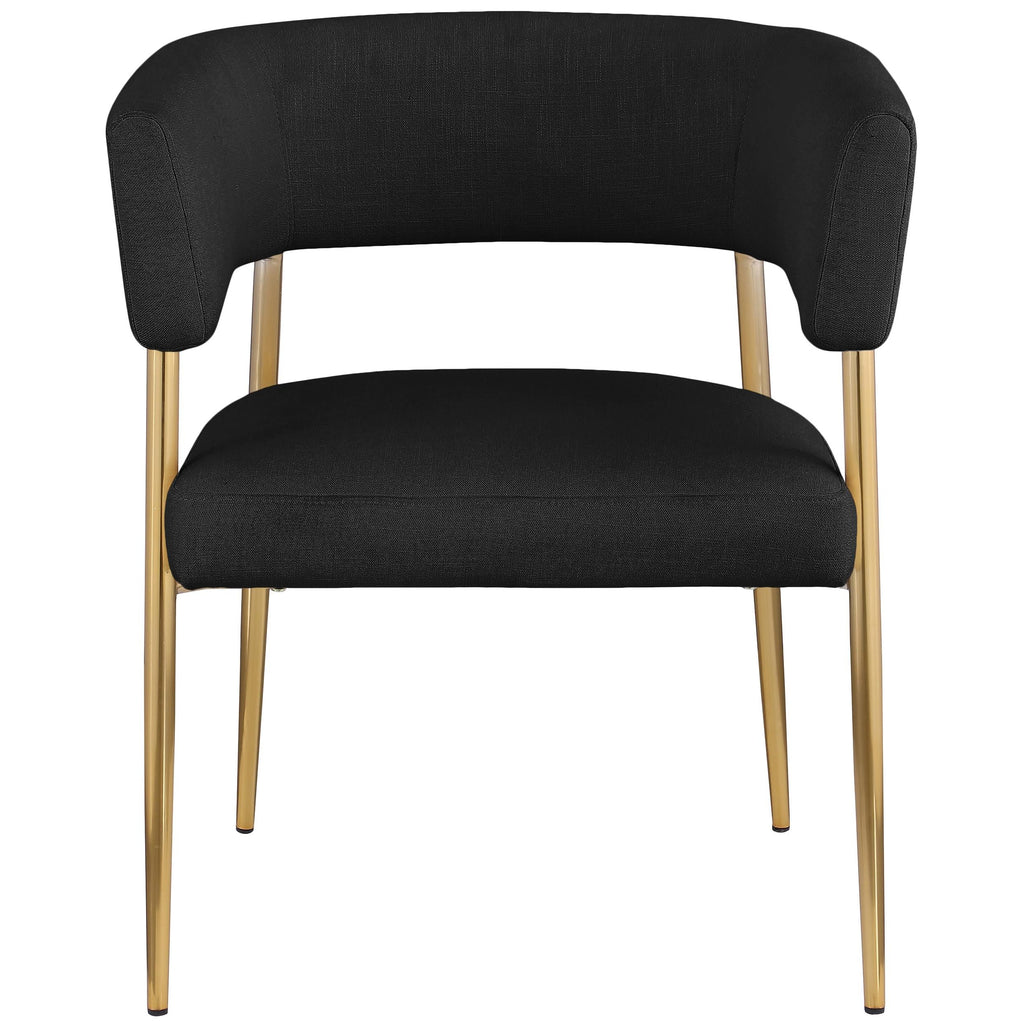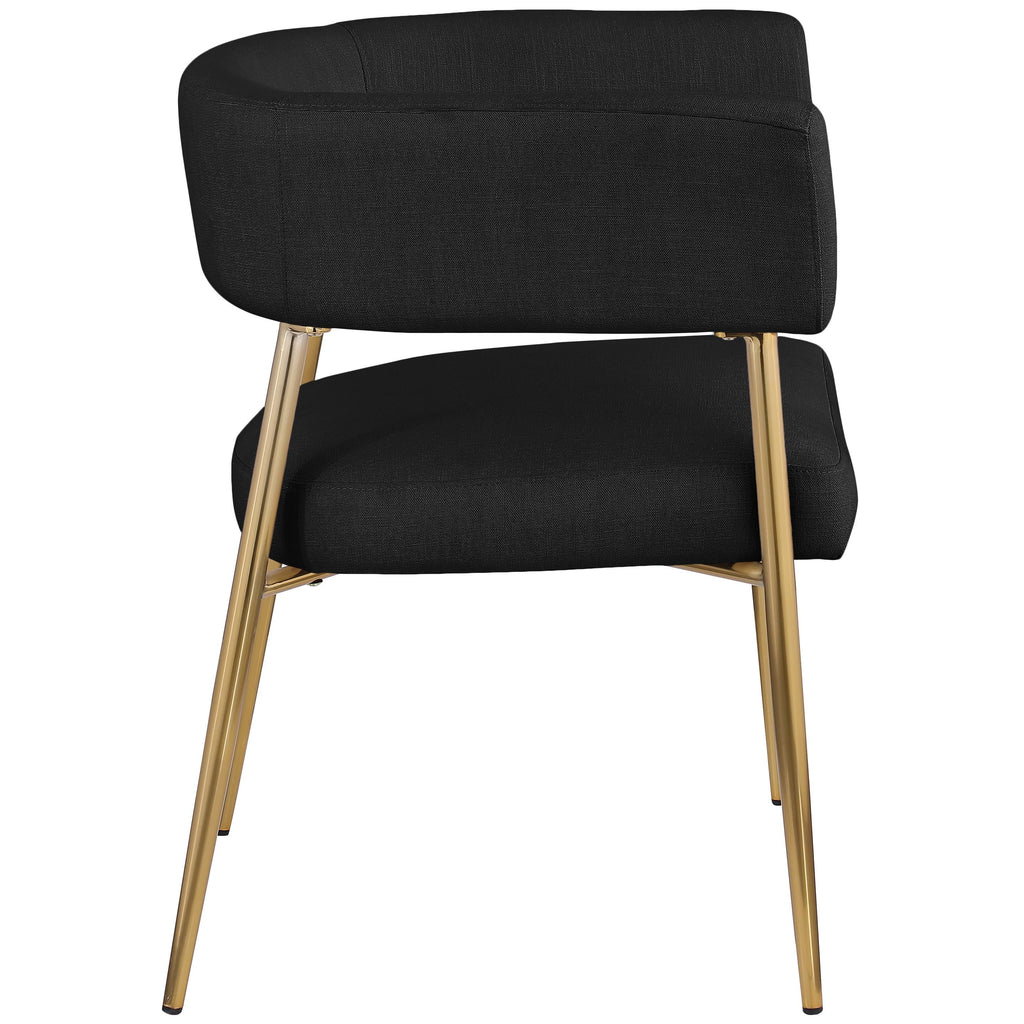 Enliven your dining area with the black Creston linen textured fabric dining chair. Upholstered in rich black durable linen textured fabric, this dining chair is not only stylish but also built to last. The brushed gold metal frame adds a touch of luxury, perfectly complementing its contemporary design. The curved back and plush cushioned seat ensure an inviting and comfortable dining experience. Whether it's for daily meals or special occasions, the Creston dining chair combines modern aesthetics with comfort.