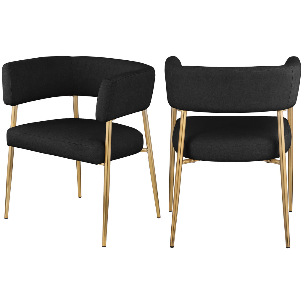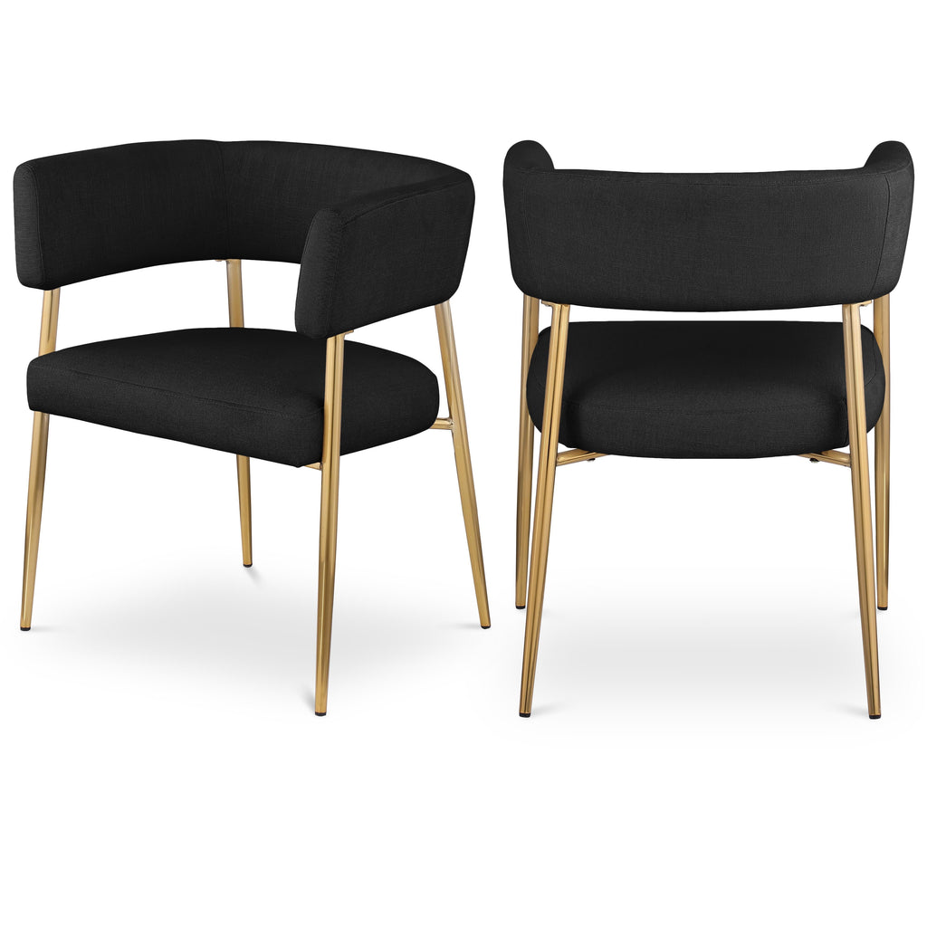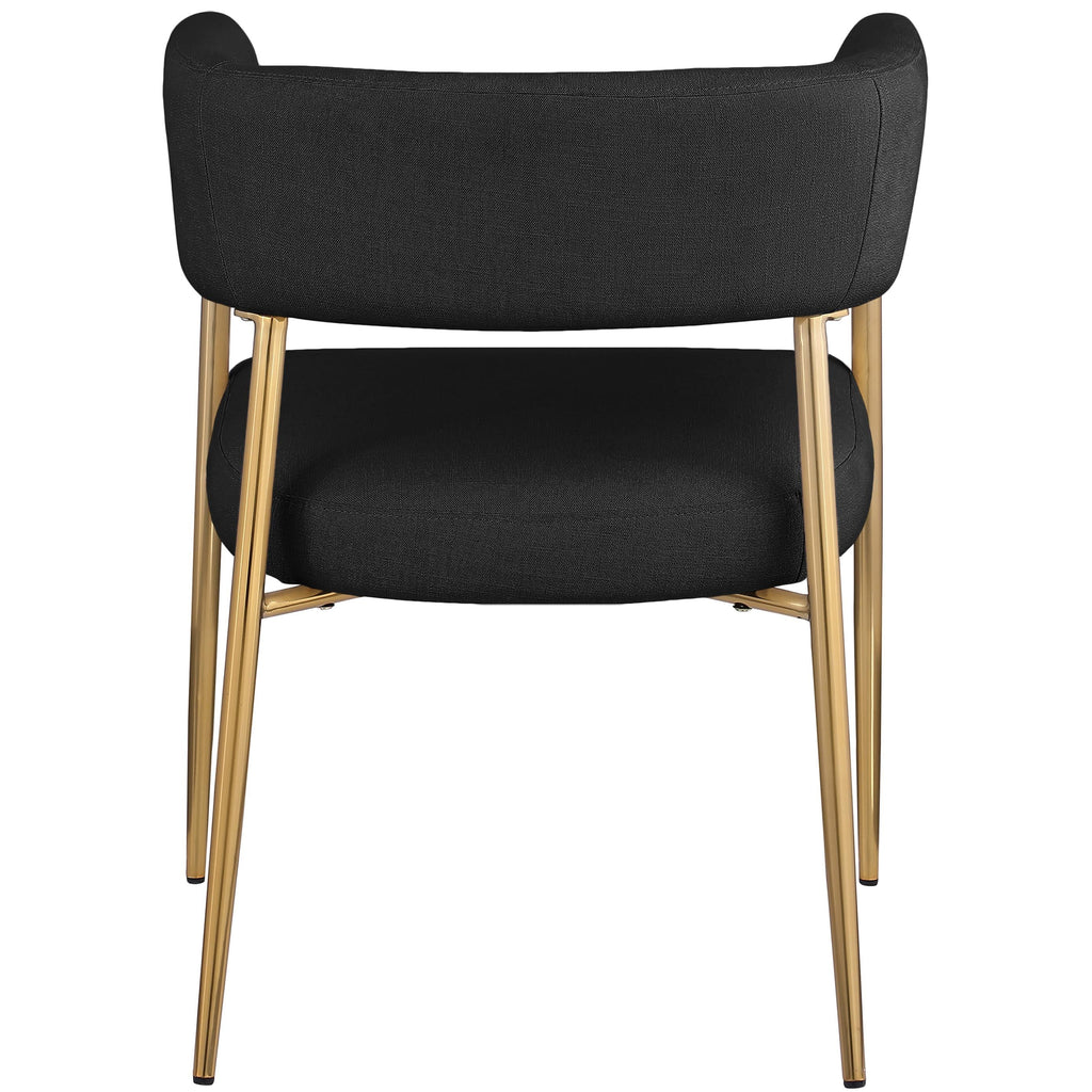 Enliven your dining area with the black Creston linen textured fabric dining chair. Upholstered in rich black durable linen textured fabric, this dining chair is not only stylish but also built to last. The brushed gold metal frame adds a touch of luxury, perfectly complementing its contemporary design. The curved back and plush cushioned seat ensure an inviting and comfortable dining experience. Whether it's for daily meals or special occasions, the Creston dining chair combines modern aesthetics with comfort.