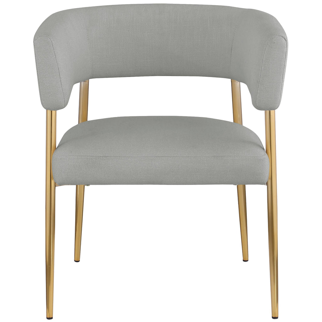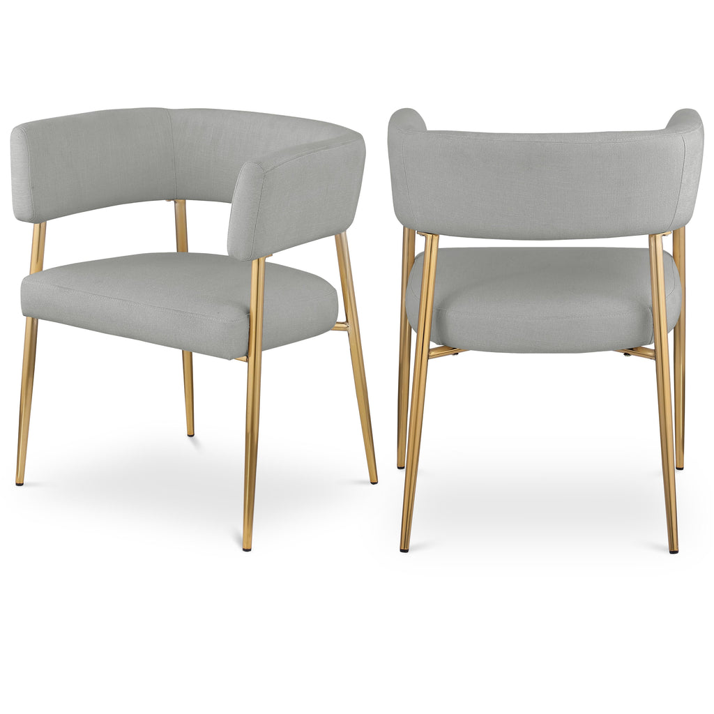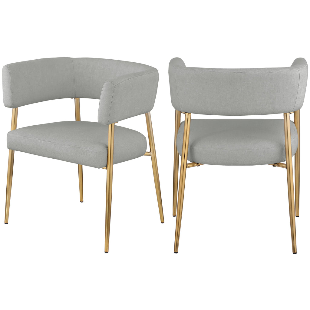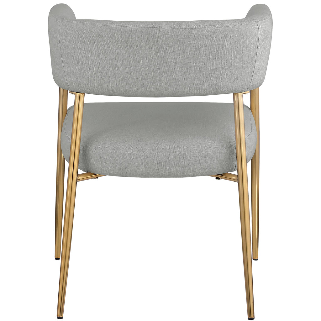 Enliven your dining area with the grey Creston linen textured fabric dining chair. Upholstered in rich grey durable linen textured fabric, this dining chair is not only stylish but also built to last. The brushed gold metal frame adds a touch of luxury, perfectly complementing its contemporary design. The curved back and plush cushioned seat ensure an inviting and comfortable dining experience. Whether it's for daily meals or special occasions, the Creston dining chair combines modern aesthetics with comfort.