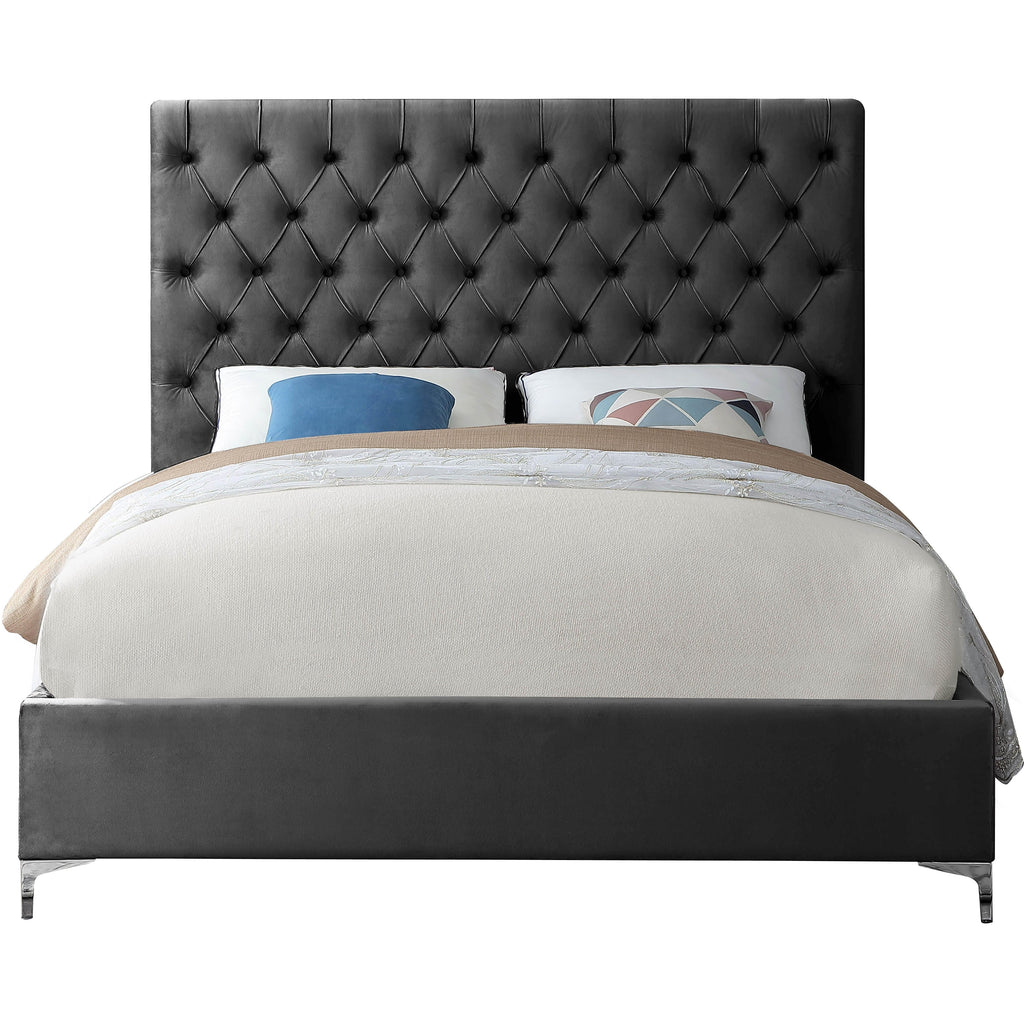 Revamp your bedroom space with this sumptuously crafted Cruz queen bed from Meridian furniture. The star of the show here is the headboardits tufted with deep button tufts that not only keep its thick padding in place and aloft, but also add a modern, textural look to your space. Sleek grey velvet upholstery feels luxuriously upscale to the touch, and the high headboard and the minimalist platform frame with metal feet add a timelessly contemporary silhouette to your space.
