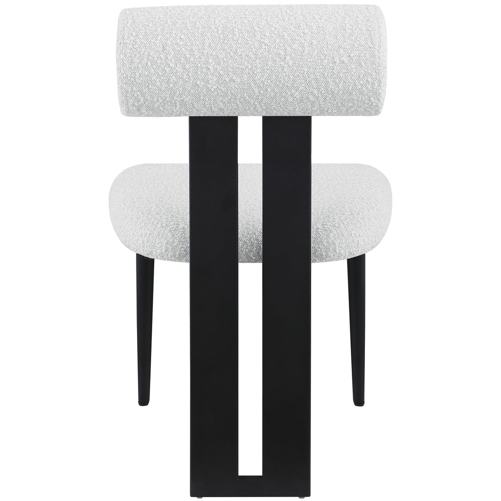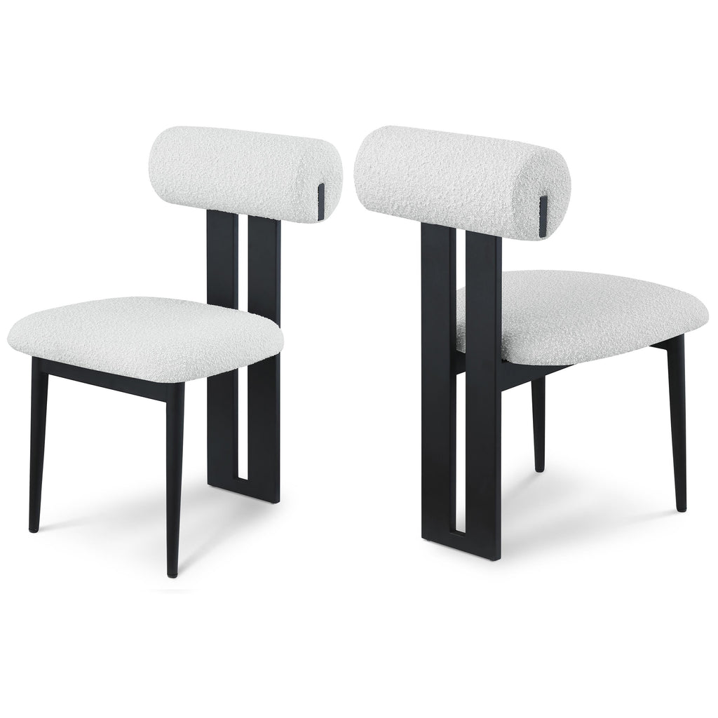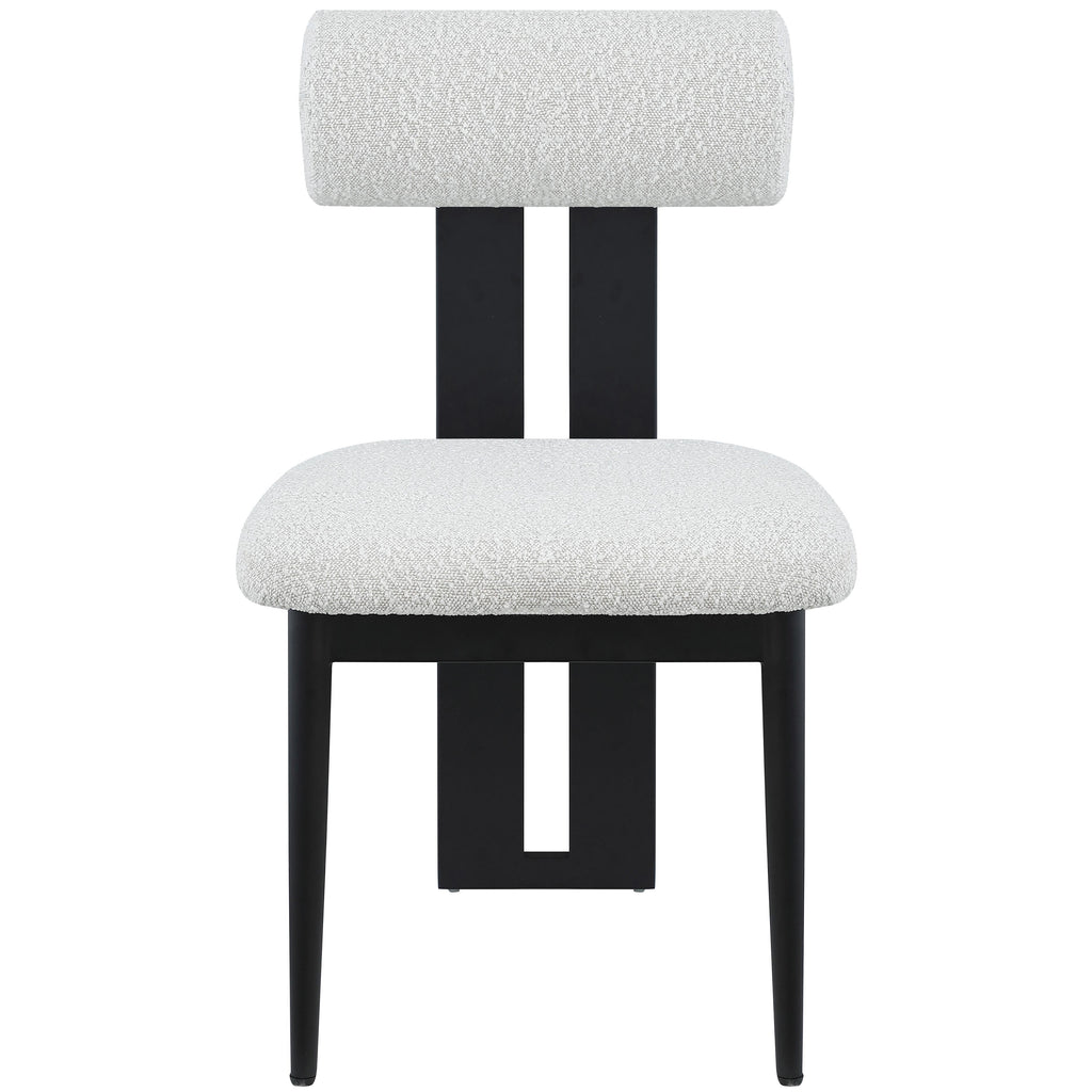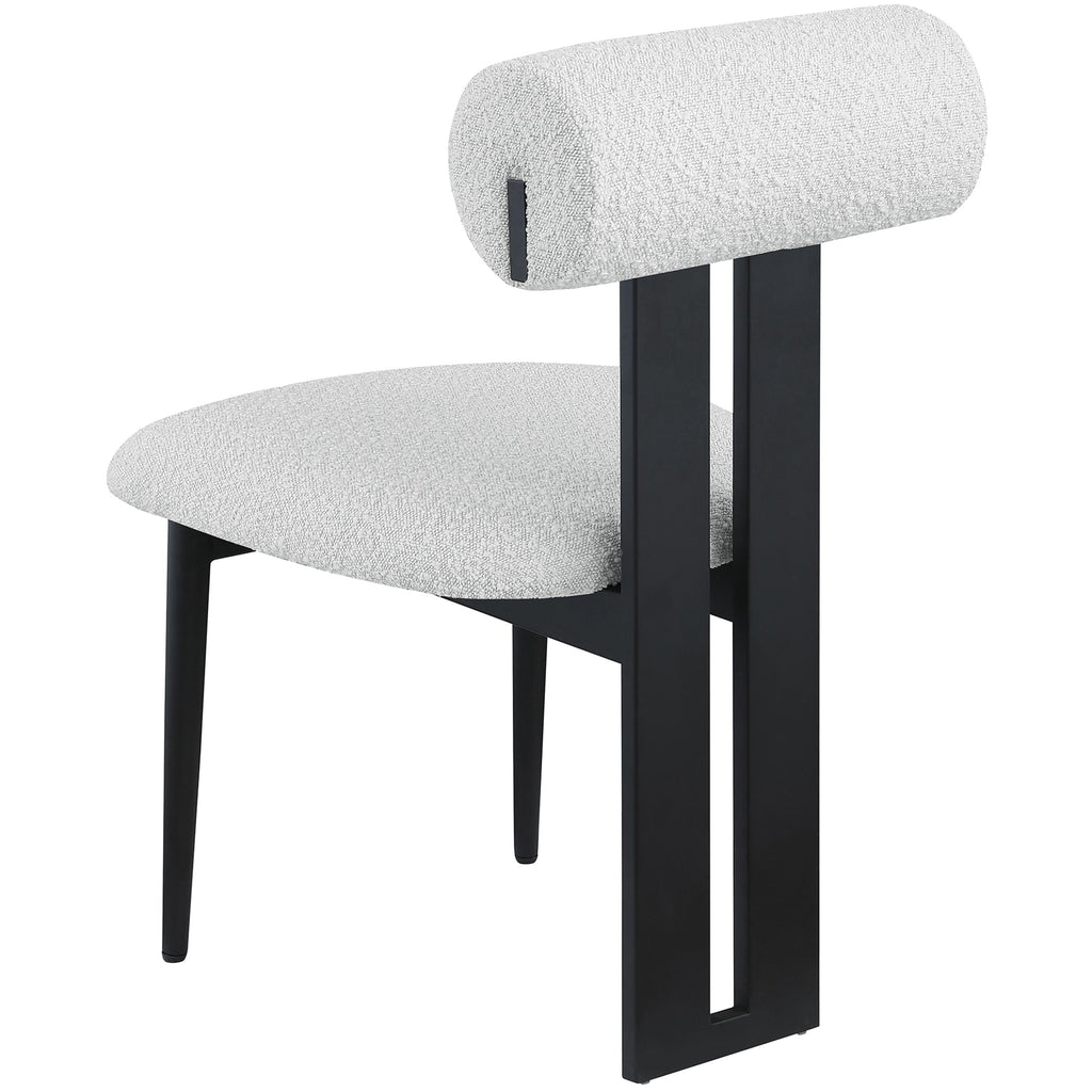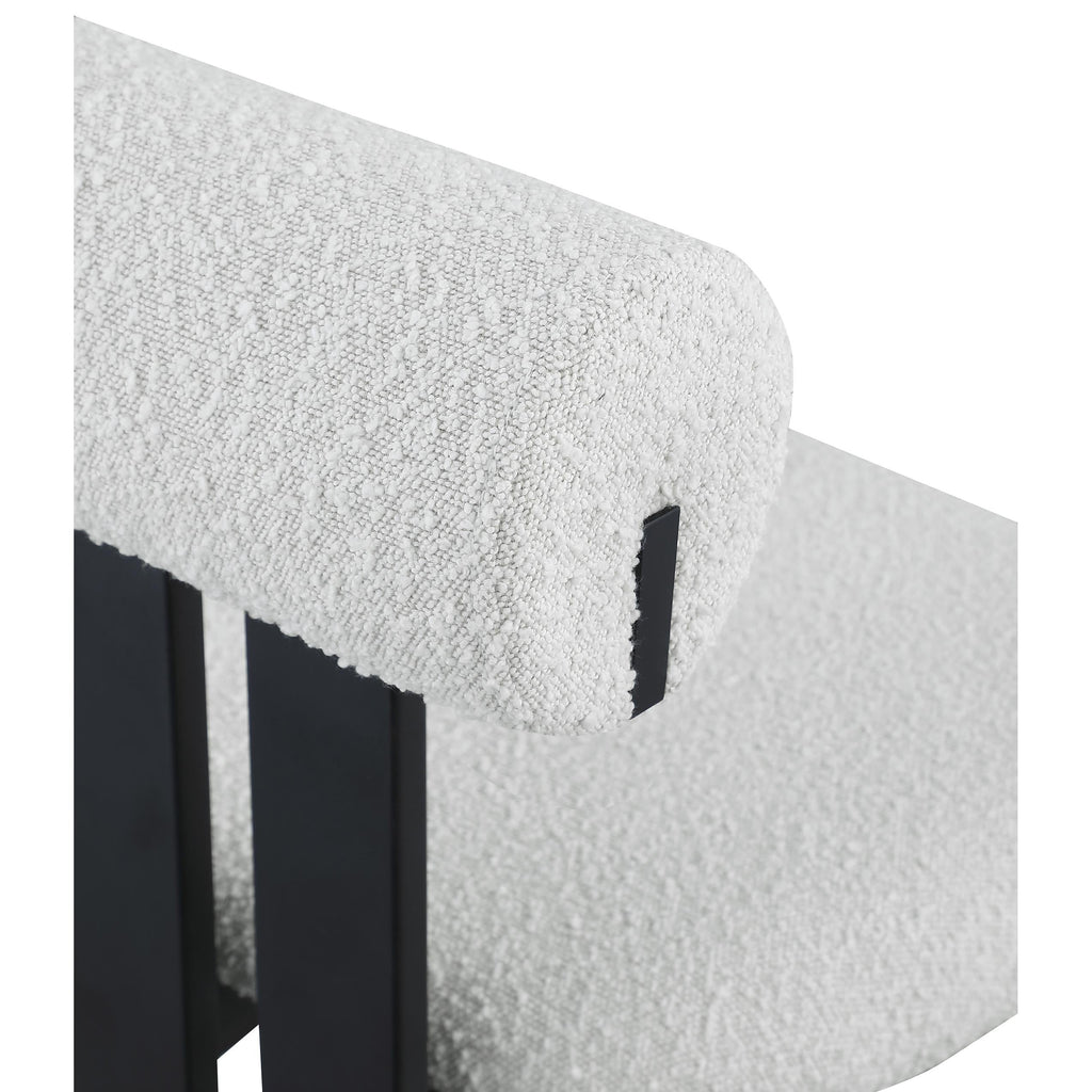 Spread contemporary beauty to your dining room space with these Dario boucle fabric dining chairs. These chairs feature a unique back-hugging rolled pillow support that makes meals more comfortable while giving the chairs a modish aesthetic. Rich cream boucle fabric on the back and seat is soft to the touch and easy to maintain, even in your busy home. Matte black frames complete the look and provide sturdy support for long-term enjoyment and performance.