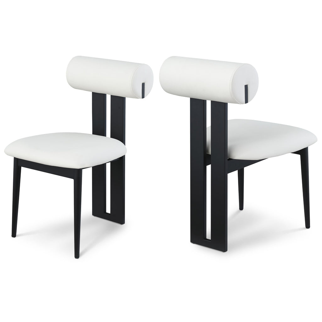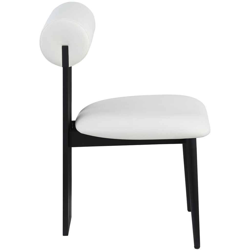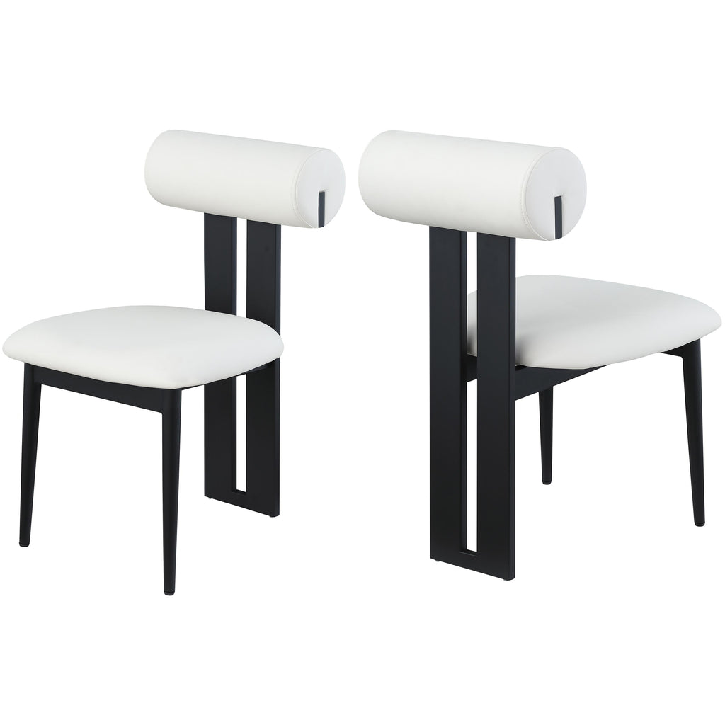 Modernize your dining room in a bold way with this Dario vegan leather dining chair pair. A unique design ensures all eyes are on these chairs during dinner, with their rolled back design and artful lines. The chairs feature soft cream vegan leather upholstery for a look that is upscale and refined without the maintenance of real leather. These contemporary chairs have thickly padded seats for comfort and an iron frame for durability.