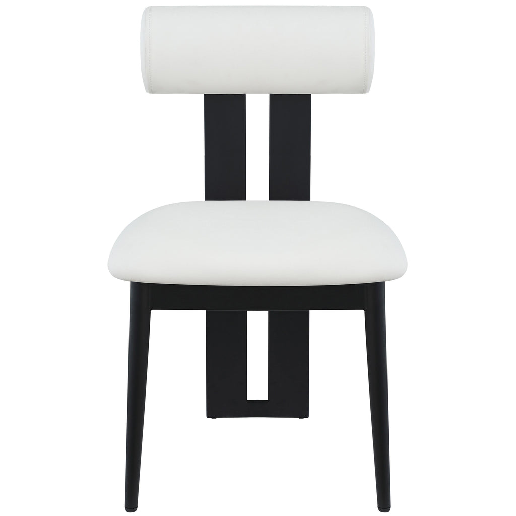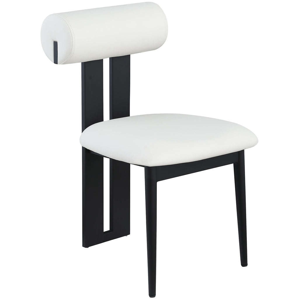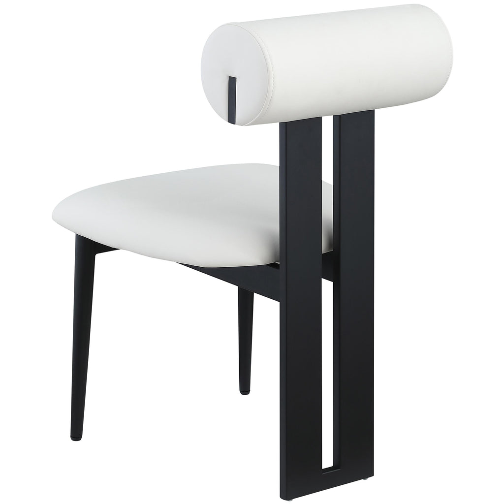 Modernize your dining room in a bold way with this Dario vegan leather dining chair pair. A unique design ensures all eyes are on these chairs during dinner, with their rolled back design and artful lines. The chairs feature soft cream vegan leather upholstery for a look that is upscale and refined without the maintenance of real leather. These contemporary chairs have thickly padded seats for comfort and an iron frame for durability.