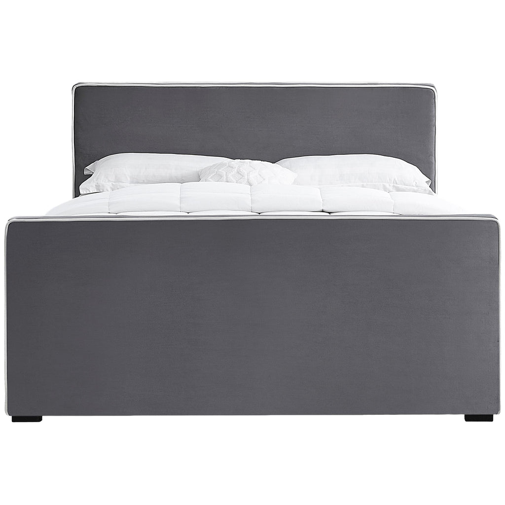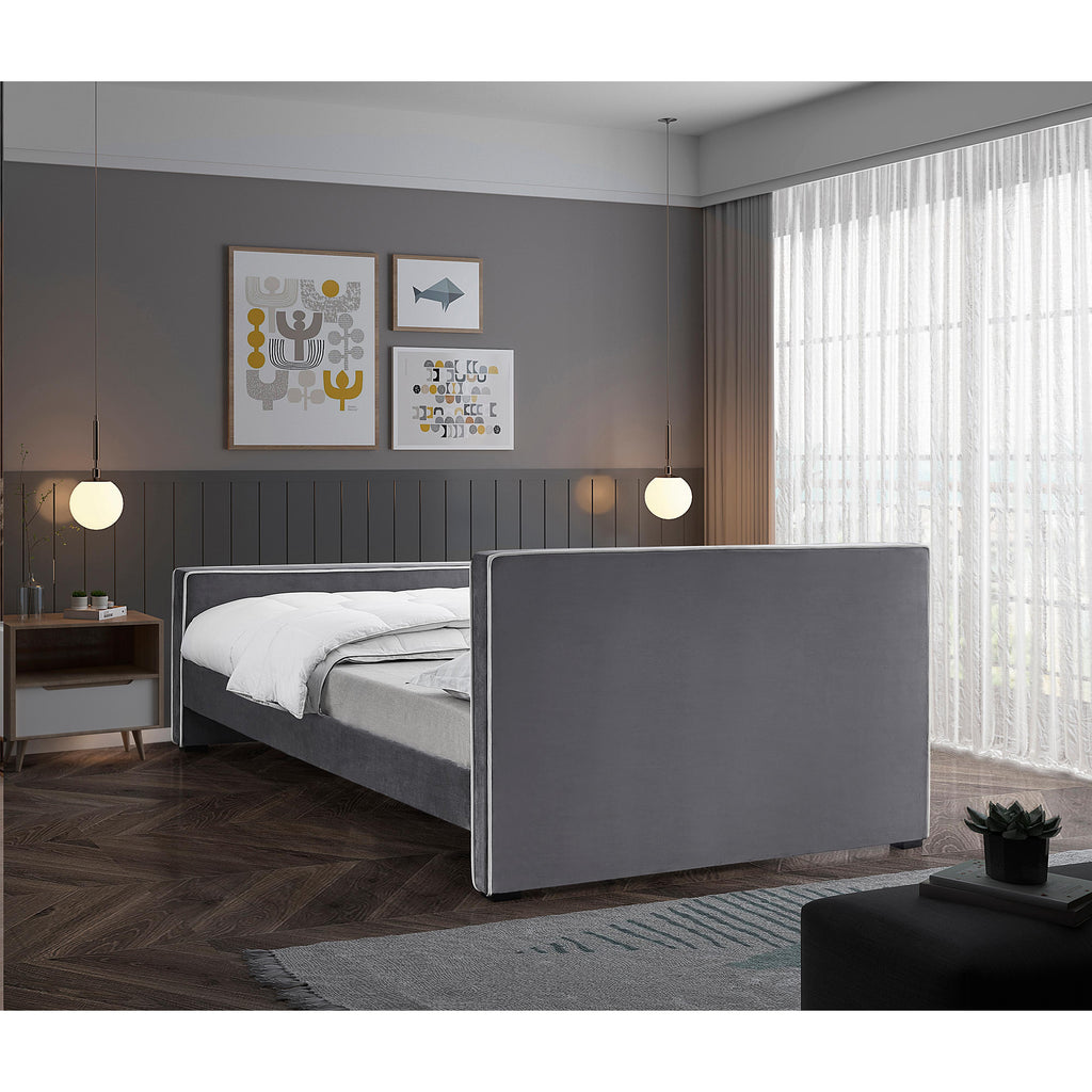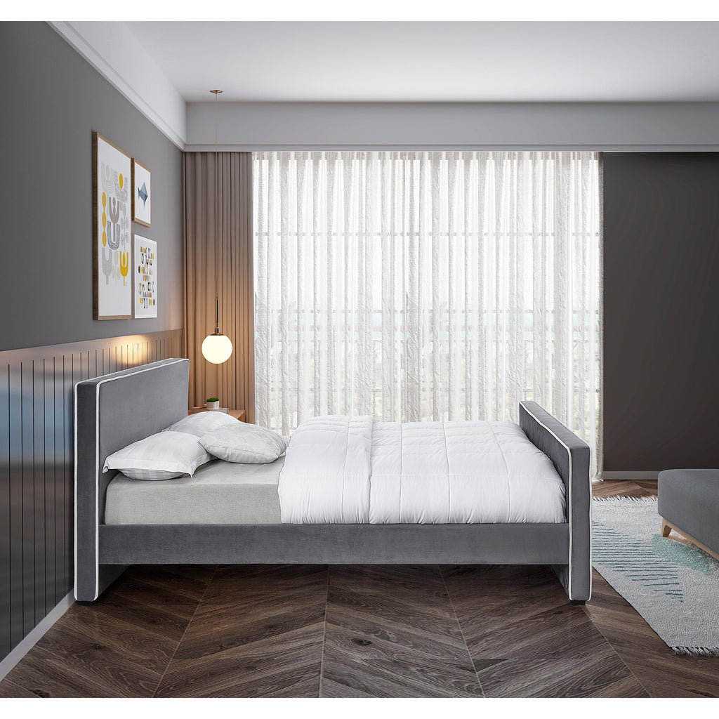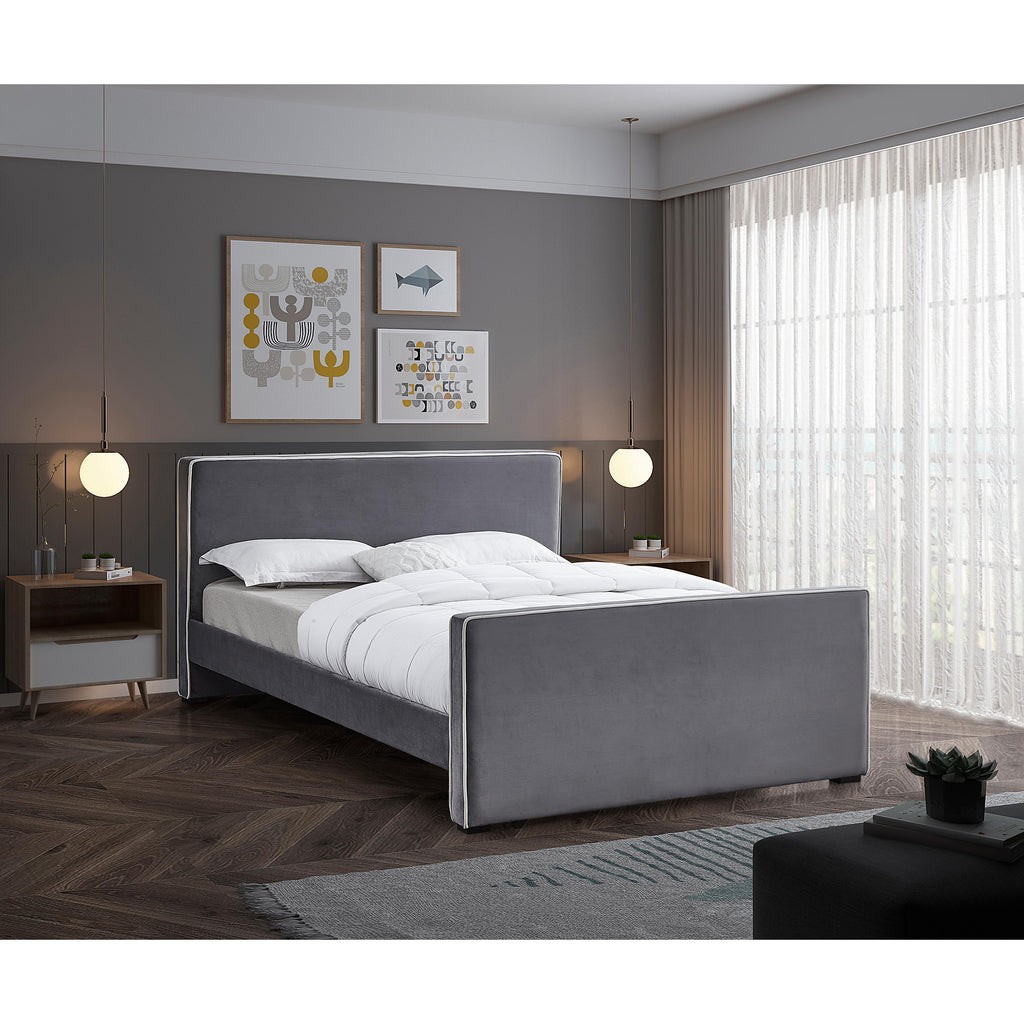Lend your bedroom an elegant look with this Dillard velvet bed. Live out your velvet fantasy with this bed's soft grey velvet upholstery that runs the full length of the bed from headboard to footboard and is trimmed with velvet piping in a contrasting color for a contemporary vibe. Dark espresso wood legs provide added support for the bed, which can be used without a box spring if desired.