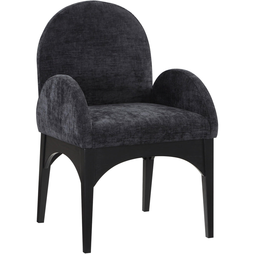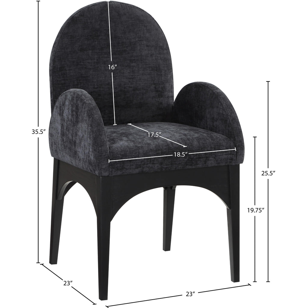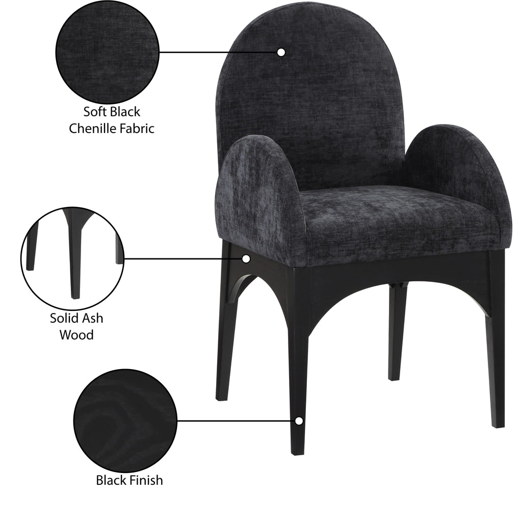 The Waldorf Chenille Fabric Dining Arm Chair exudes elegance and comfort. Crafted with solid ash wood, this dining chair boasts a sturdy and durable construction. The black finished legs provide a sleek and welcoming touch to the overall design. The plush black chenille fabric on the seat and backrest of the chair offers a soft and cozy seating experience, making it an ideal choice for long dinner conversations with family and friends.