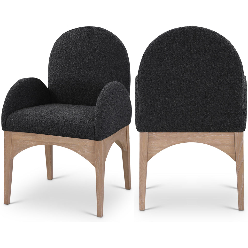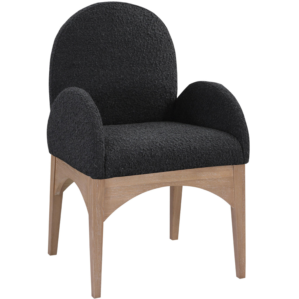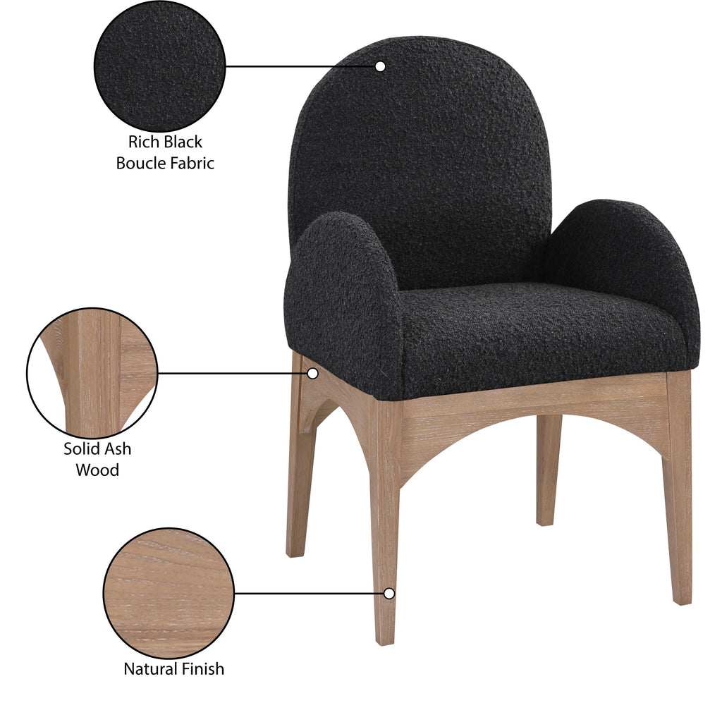The Waldorf Boucle Fabric Dining Arm Chair exudes elegance and comfort. Crafted with solid ash wood, this dining chair boasts a sturdy and durable construction. The natural finished legs provide a warm and welcoming touch to the overall design. The plush black boucle fabric on the seat and backrest of the chair offers a soft and cozy seating experience, making it an ideal choice for long dinner conversations with family and friends.