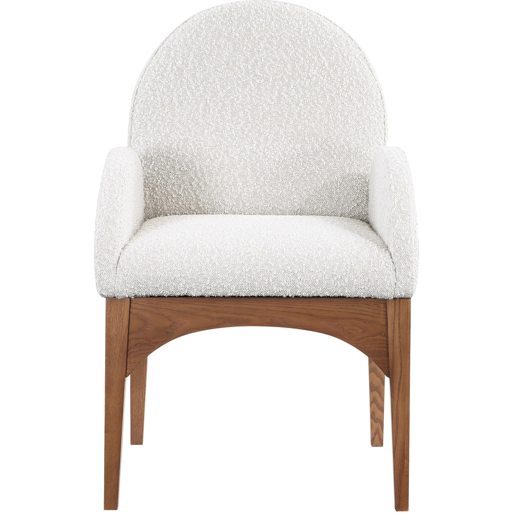 The Waldorf Boucle Fabric Dining Arm Chair exudes elegance and comfort. Crafted with solid ash wood, this dining chair boasts a sturdy and durable construction. The walnut finished legs provide a warm and welcoming touch to the overall design. The plush cream boucle fabric on the seat and backrest of the chair offers a soft and cozy seating experience, making it an ideal choice for long dinner conversations with family and friends.