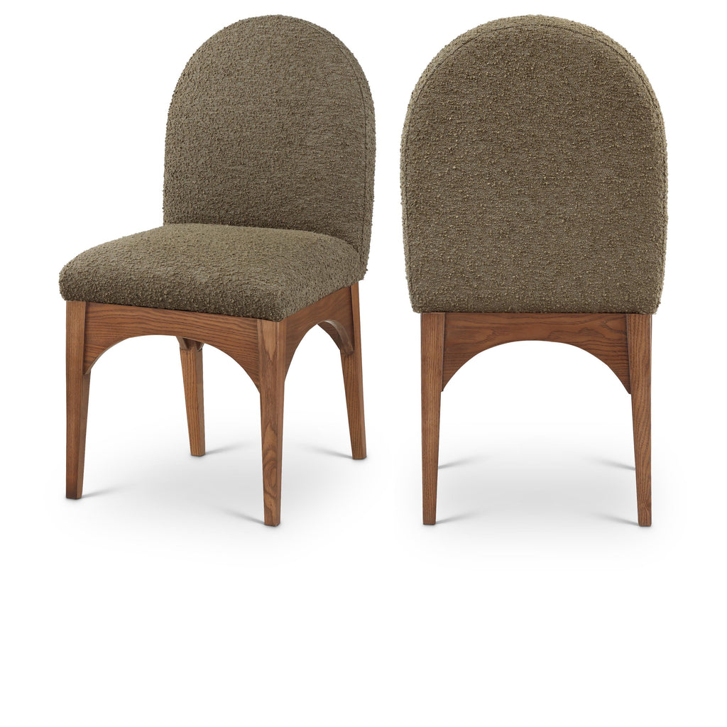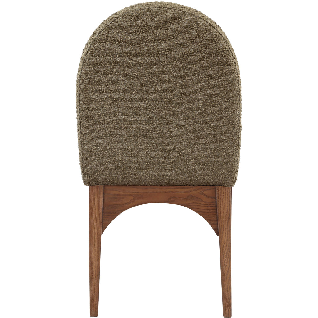 The Waldorf Boucle Fabric Dining Side Chair exudes elegance and comfort. Crafted with solid ash wood, this dining chair boasts a sturdy and durable construction. The walnut finished legs provide a warm and welcoming touch to the overall design. The plush olive boucle fabric on the seat and backrest of the chair offers a soft and cozy seating experience, making it an ideal choice for long dinner conversations with family and friends.