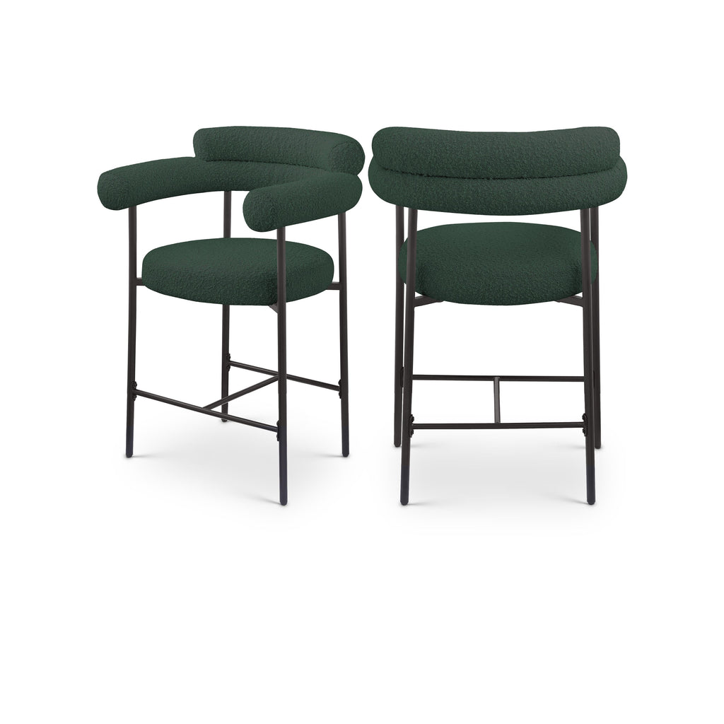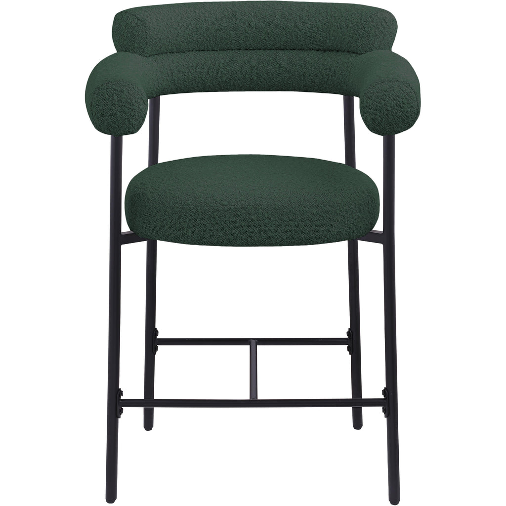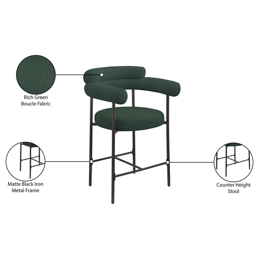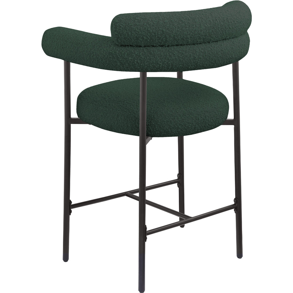 If what you crave is a home bar rescue or kitchen counter rehab, then this Blake counter stool in green boucle fabric is a good place to start. This beautiful stool has the creature comforts you're looking for to keep guests happy and coming back for more, including a rounded back for structural body support and plump cushions that make sitting and chatting more comfortable. A black matte iron metal frame is sturdy and durable, while the rich green boucle fabric adds a chic touch.