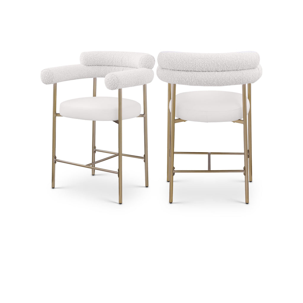 Chic is the word of the day when you give your kitchen counter or home bar a new look with this Blake cream boucle fabric and vegan leather counter stool. A curved back ensures body-hugging comfort while sipping mimosas or chowing down on breakfast fare. The brushed brass iron metal frame provides reliable support for this counter height stool while the rich cream boucle fabric upholstery and soft vegan leather padding ensure comfort for all who decide to take a meal (or have a snack) with you.