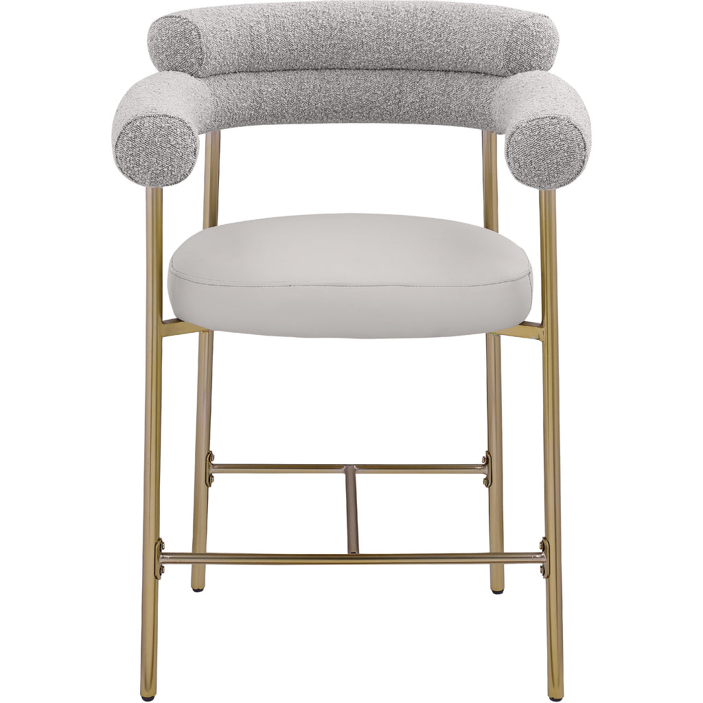 Chic is the word of the day when you give your kitchen counter or home bar a new look with this Blake taupe boucle fabric and vegan leather counter stool. A curved back ensures body-hugging comfort while sipping mimosas or chowing down on breakfast fare. The brushed brass iron metal frame provides reliable support for this counter height stool while the rich taupe boucle fabric upholstery and soft vegan leather padding ensure comfort for all who decide to take a meal (or have a snack) with you.