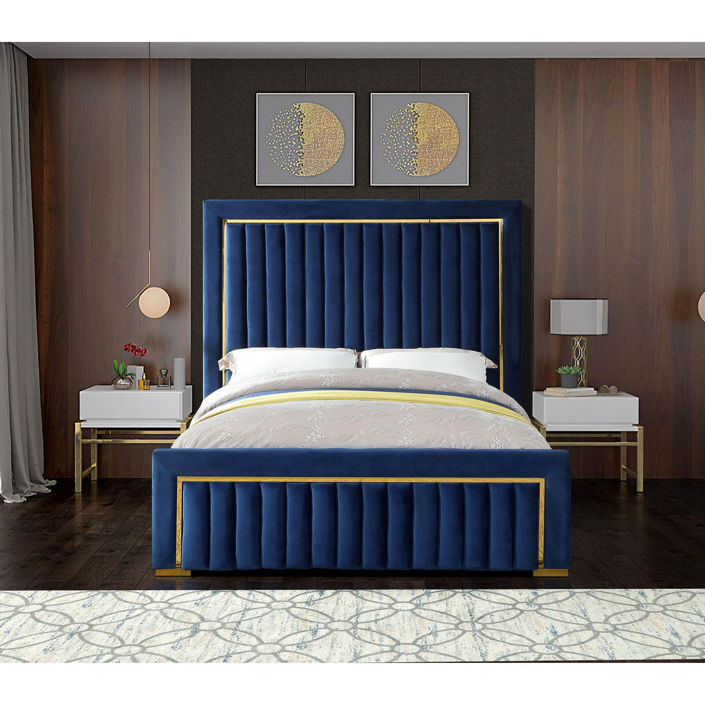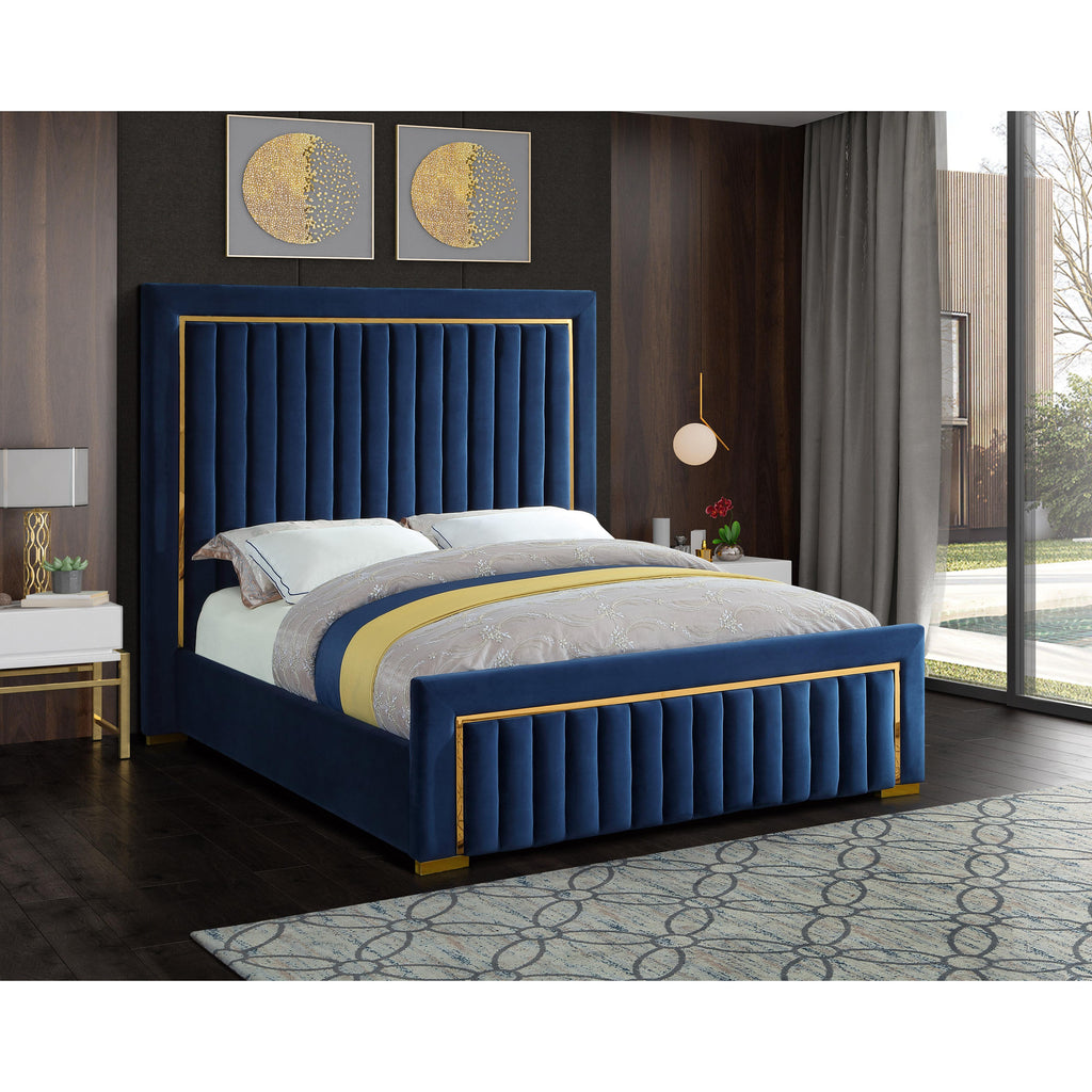 Ensconce yourself in regal modernity in this Dolce Navy Velvet Queen Bed. A super tall headboard makes this Dolce bed hard to ignore, ensuring it is the focal point in your bedroom sanctuary. The padded headboard is plump and welcoming, making it ideal for propping up against while you read the daily news or watch some TV. Gold trim and channel tufting add to the headboard's luxurious look, lending it an air of regality and upscale refinement. The navy velvet upholstery is buttery-soft and lavish to the touch, making you feel like royalty with every nap.