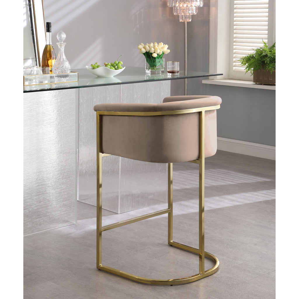 Complement your contemporary home furnishing with this Donatella Beige Velvet Stool from Meridian Furniture. Its curved design and rich beige velvet upholstery provides a comfortable, soft, luxurious seat for you to relax in, while also adding a touch of elegance to your living space. Its gold steel base adds the perfect balance to the stool's soft beige color, in addition to holding the stool up to counter height and providing durable support for years to come.
