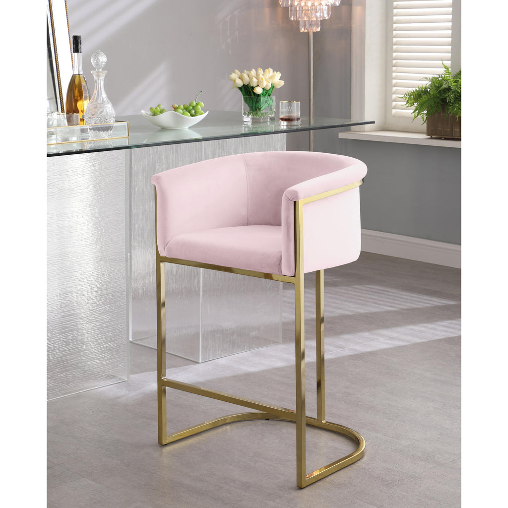Complement your contemporary home furnishing with this Donatella Pink Velvet Stool from Meridian Furniture. Its curved design and rich beige velvet upholstery provides a comfortable, soft, luxurious seat for you to relax in, while also adding a touch of elegance to your living space. Its gold steel base adds the perfect balance to the stool's soft pink color, in addition to holding the stool up to counter height and providing durable support for years to come.