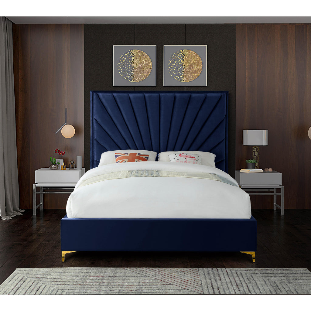 Turn up the wow factor in your bedroom with this Eclipse Queen Bed from Meridian Furniture. Stunning velvet upholstery in a posh navy blue color brings rich elegance and style to your space. A fan-like shell pattern on the headboard is achieved with channel tufting, which keeps the padded headboard plump and full, so it supports your back while you sit up in bed, binging on your favorite shows. Metal legs finish off this bed's luxe look, giving it a modish slant.
