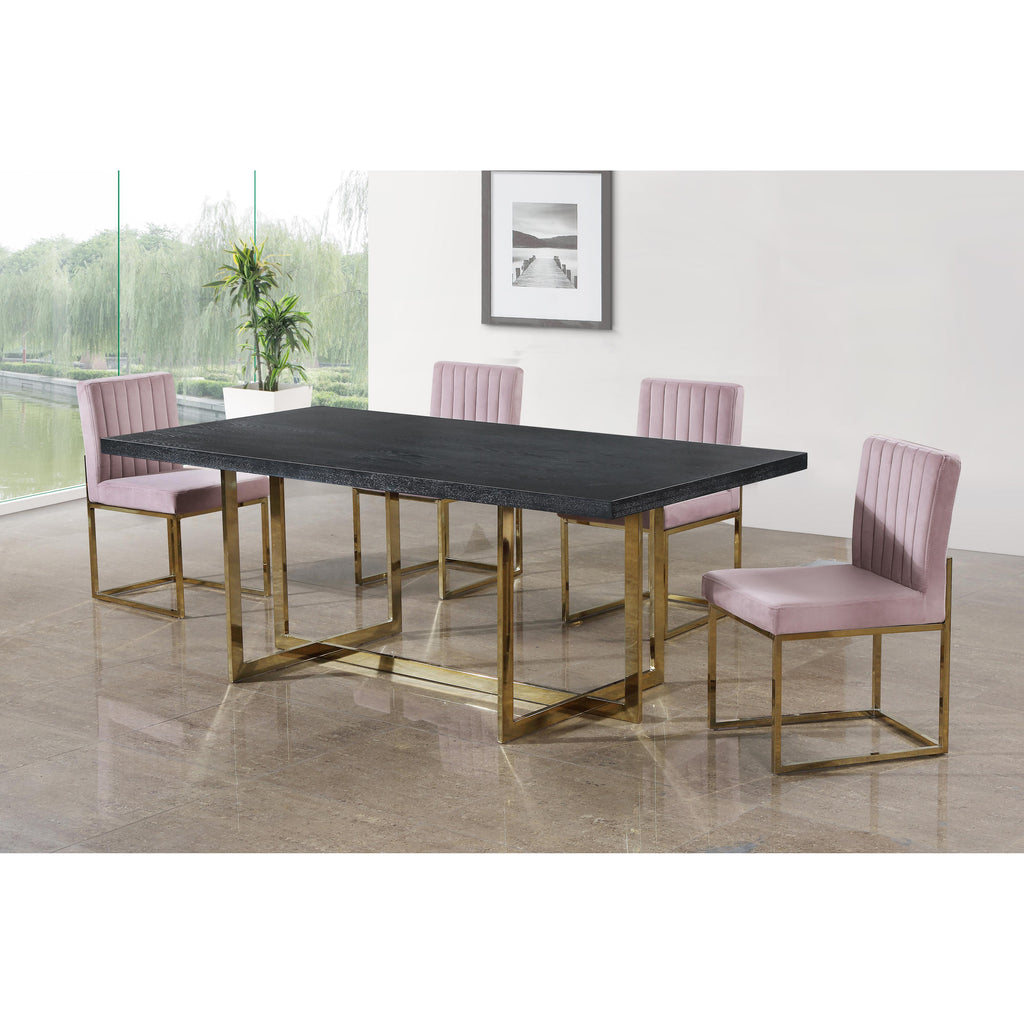 Give dinner guests a stylish spot to relax and unwind with this Elle Gold Dining Table. This table features a polished gold chrome design with a coordinating Black Charcoal MDF top for a look that is modern and chic. The expansive top gives you plenty of elbow room at mealtime, so guests stay comfortable from appetizers through dessert, and it's a black charcoal color gives it an ultra contemporary look making it easy to pair with the chairs of your choice.