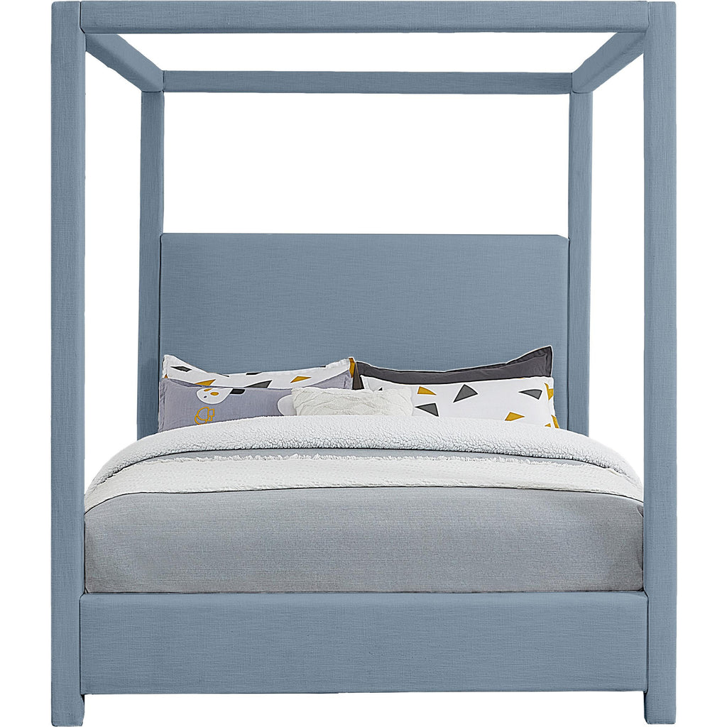 Get plenty of Z's when you sleep in this Emerson sky blue linen textured fabric queen bed. This canopy bed is fit for a queen, with four posts providing a luxurious frame for your mattress. Its mid-century modern design and rich sky blue linen textured fabric gives the bedframe a cozy feel, maqueen it a wonderful addition to any sleeping space. With its unique blend of wood, linen textured, and foam construction, this Emerson queen sized bed is both sturdy and large enough to fit royalty.