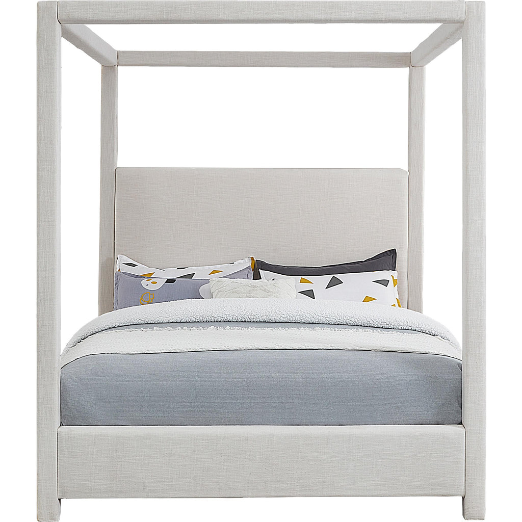 Get plenty of Z's when you sleep in this Emerson cream linen textured fabric queen bed. This canopy bed is fit for a queen, with four posts providing a luxurious frame for your mattress. Its mid-century modern design and rich cream linen textured fabric gives the bedframe a cozy feel, maqueen it a wonderful addition to any sleeping space. With its unique blend of wood, linen textured, and foam construction, this Emerson queen sized bed is both sturdy and large enough to fit royalty.